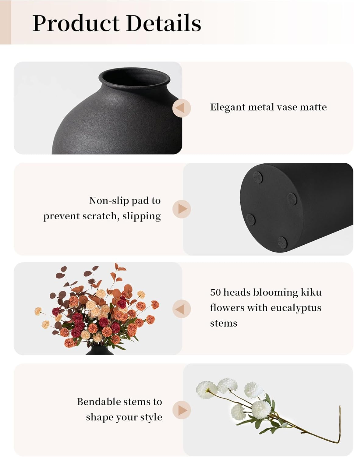 - Burnt Orange Kiku Flower in Black Metal Vase: The package comes with 10 lifelike pom poms balls, 2 eucalyptus stems and 1 metal vase. This elegant fake flowers in vase captures the essence of gorgeous floral decor, perfect for creating stunning fall Thanksgiving table centerpieces