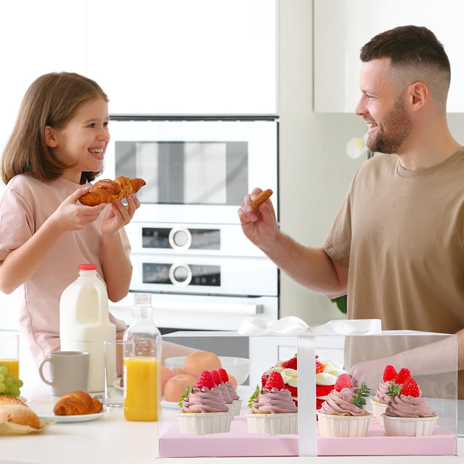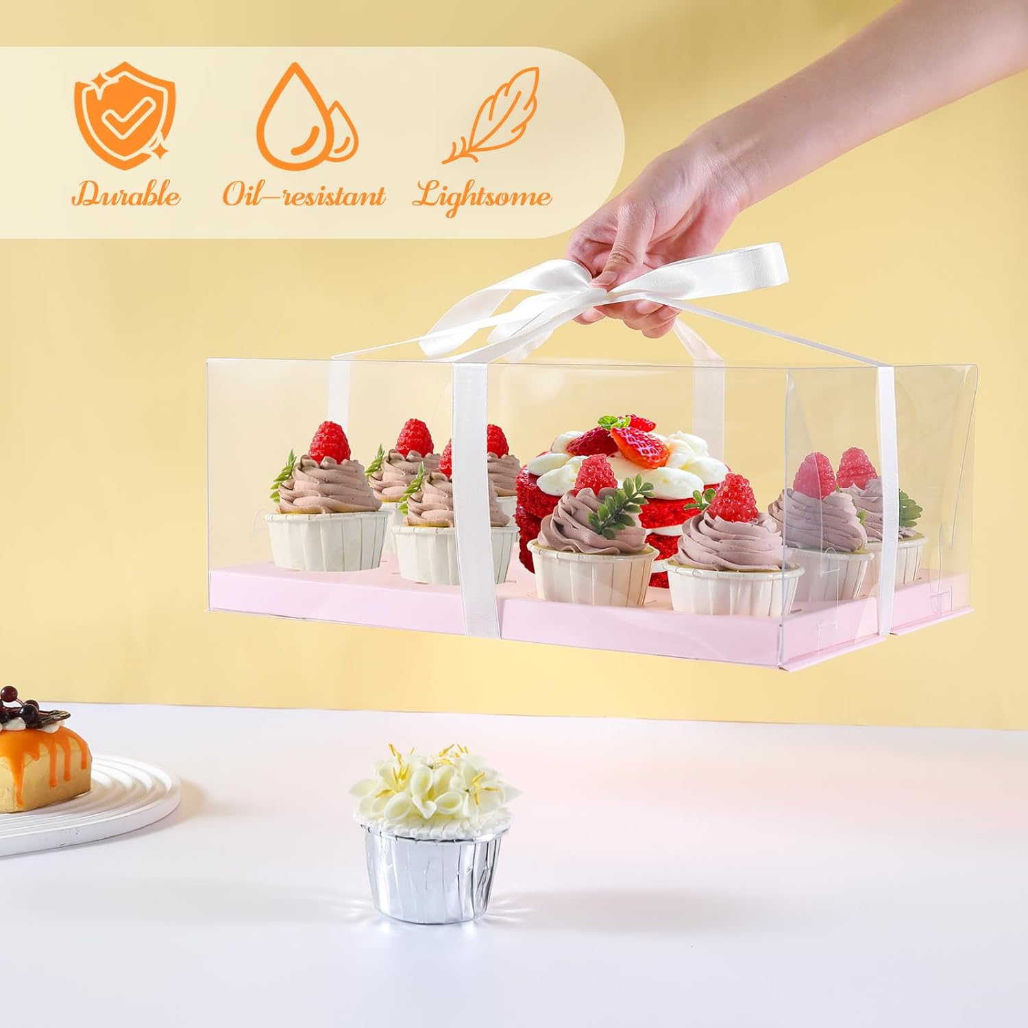 - Package Includes:3pcs clear cupcake boxes + 3pcs inserts + 1 roll ribbon.The paper inserts keep the cupcakes stay in place from moving around. The cake box has a wide viewing angle, perfect for showcasing cakes while protecting them. It is a great choice for making cupcakes and pastries.