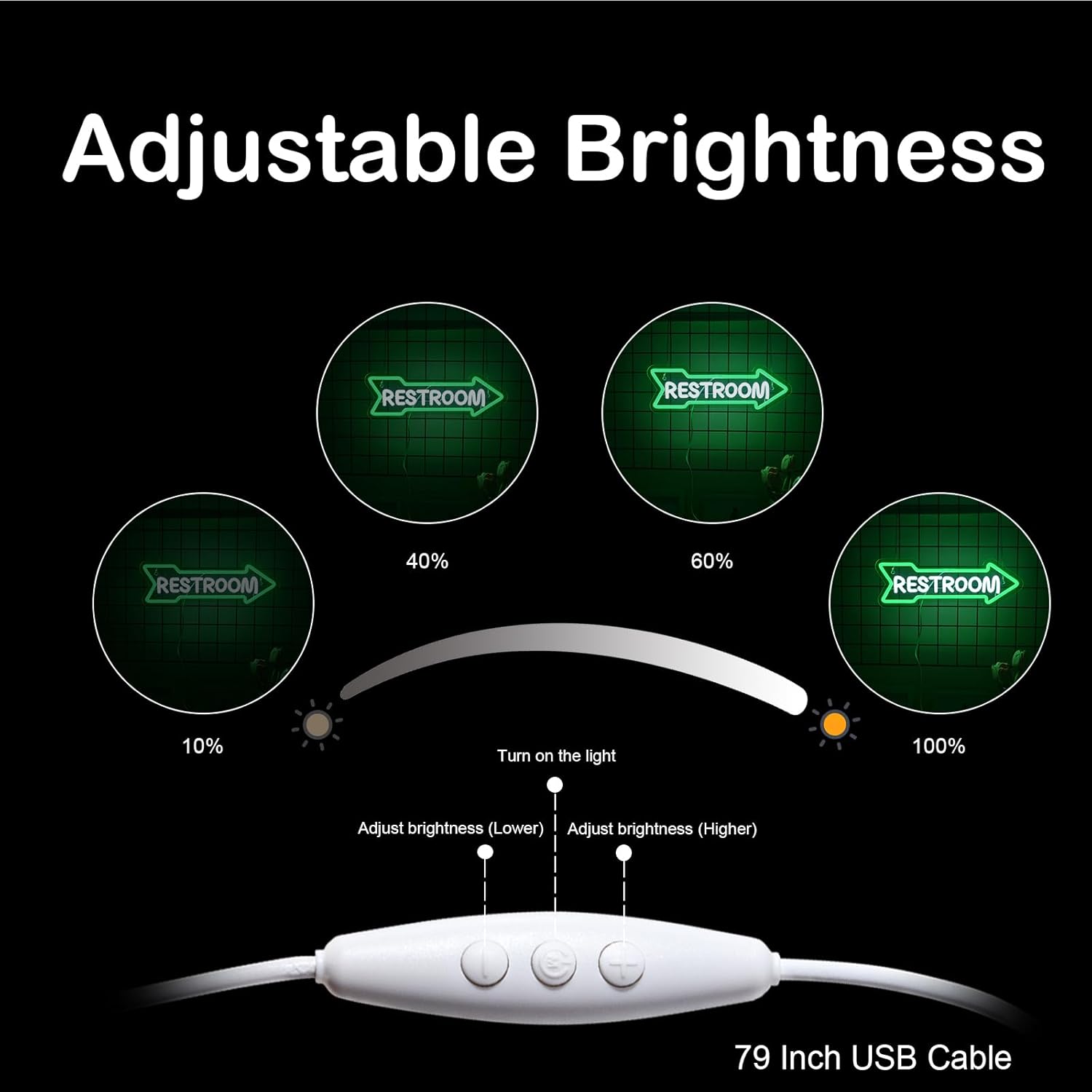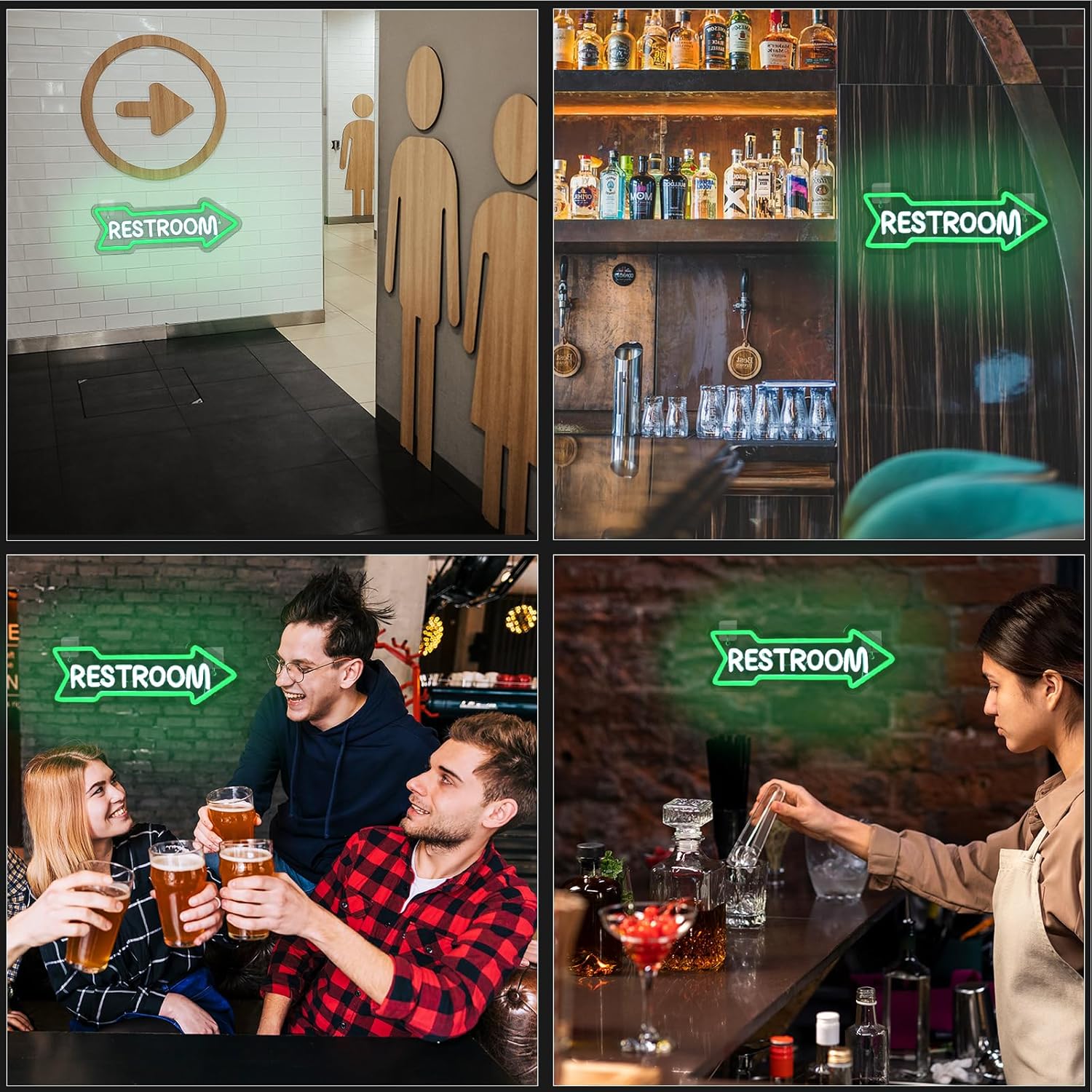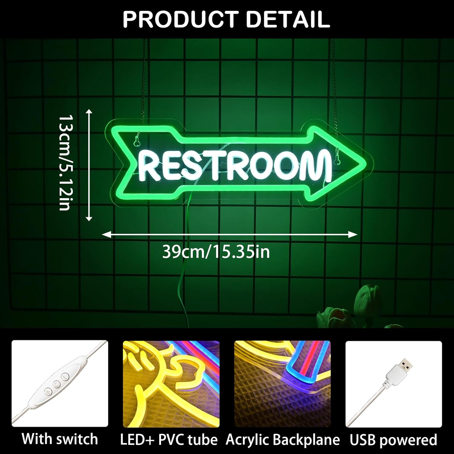 - Restroom Arrow neon sign: measures 15.35 x 5.12 inches with high transparency acrylic sheets and LED lights to create a more suitable environment and atmosphere for personal care