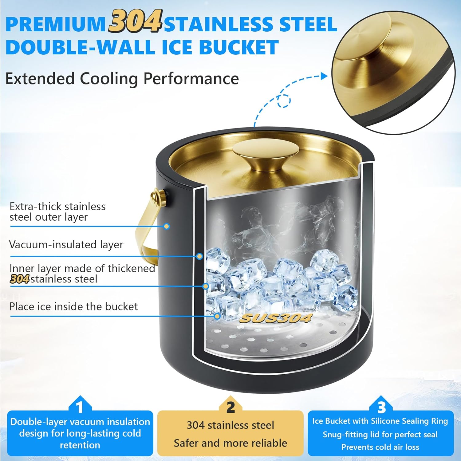 - 【SILICONE SEALING RING】Ice Bucket with Silicone Sealing Ring, Snug-fitting lid for perfect seal,to prevents cold air loss.Full-coverage beverage insulation