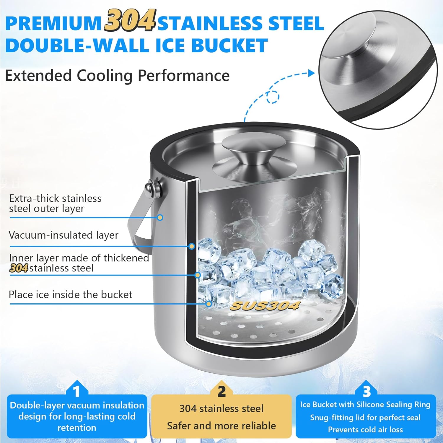 - 【SILICONE SEALING RING】Ice Bucket with Silicone Sealing Ring, Snug-fitting lid for perfect seal,to prevents cold air loss.Full-coverage beverage insulation