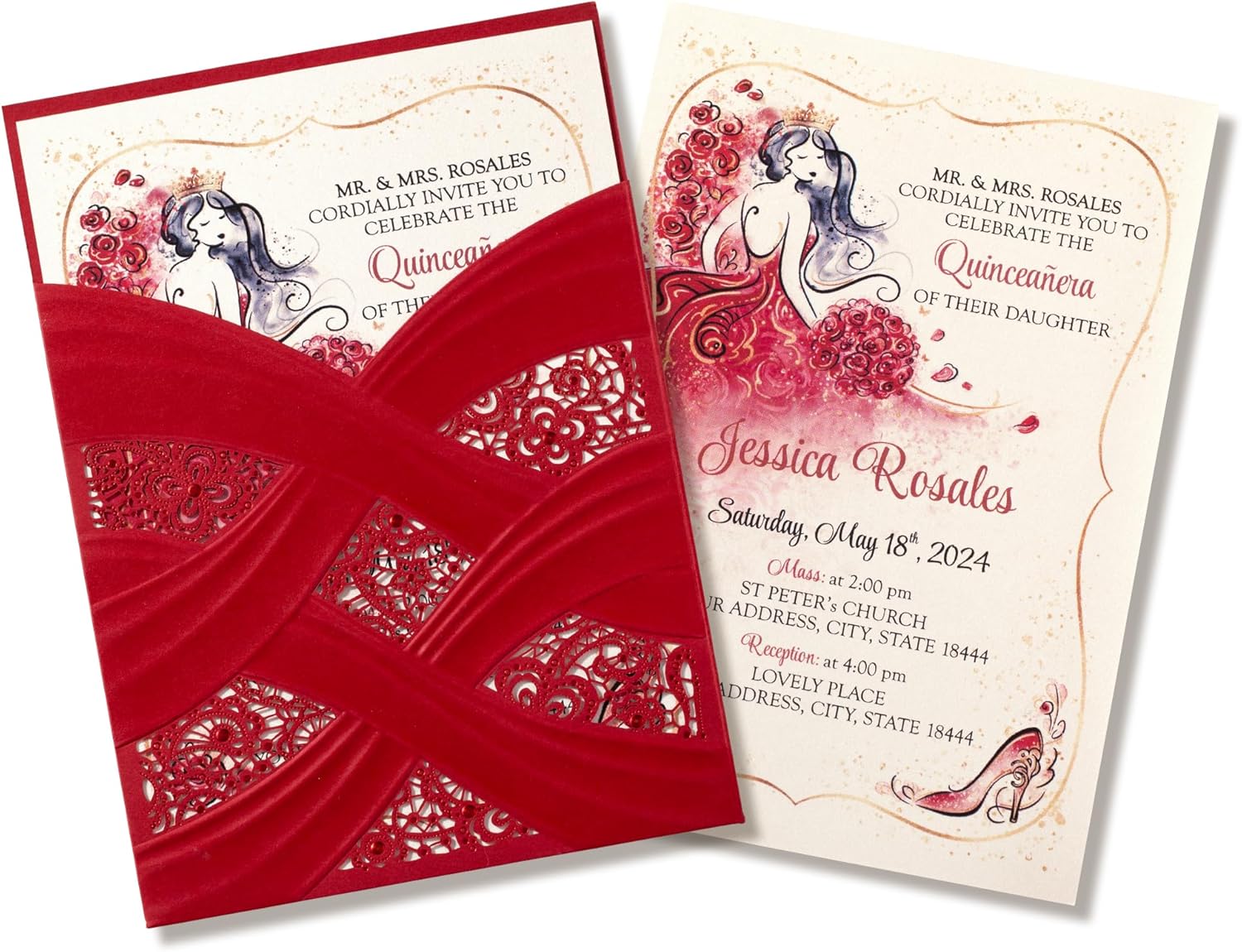 50pcs Laser Cut Quinceanera Invitations with Envelopes Red, 5x7.3 Personalized Invitation Cards for Wedding