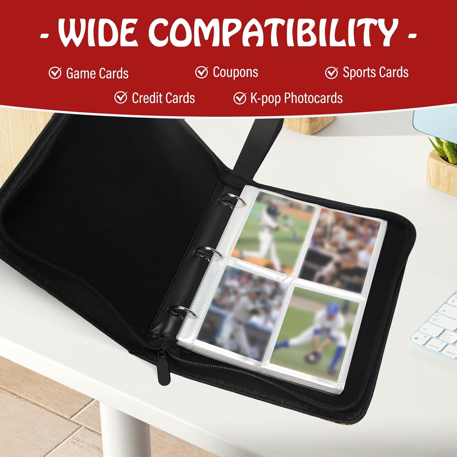 - Large Capacity Size: Inside page size: 2.68*3.5in,The card binder comes with 50 removable sleeves, which can hold up to 400 trading cards with 4 pockets on each side, allowing you to store cards on both the front and back.The trading card binder case is compatible with svarious standard-sized cards, Game Card , Football cards, Baseball cards