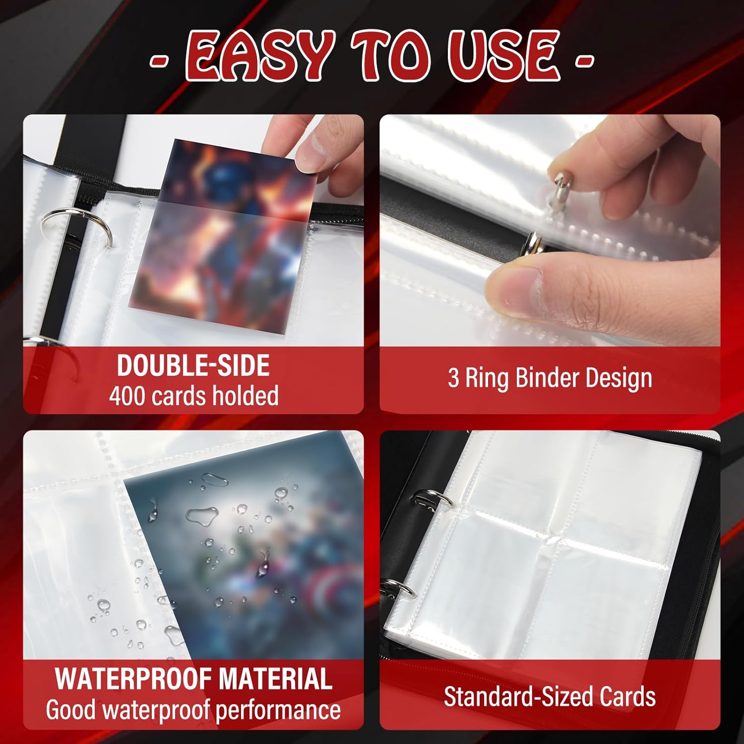 - Large Capacity Size: Inside page size: 2.68*3.5in,The card binder comes with 50 removable sleeves, which can hold up to 400 trading cards with 4 pockets on each side, allowing you to store cards on both the front and back.The trading card binder case is compatible with svarious standard-sized cards, Game Card , Football cards, Baseball cards