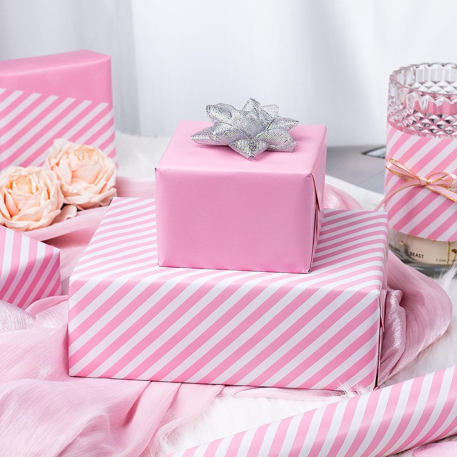 - Double-Sided Wrapping Paper: One side has pink and white stripes, and the other is solid pink, perfect for a stylish and unique presentation