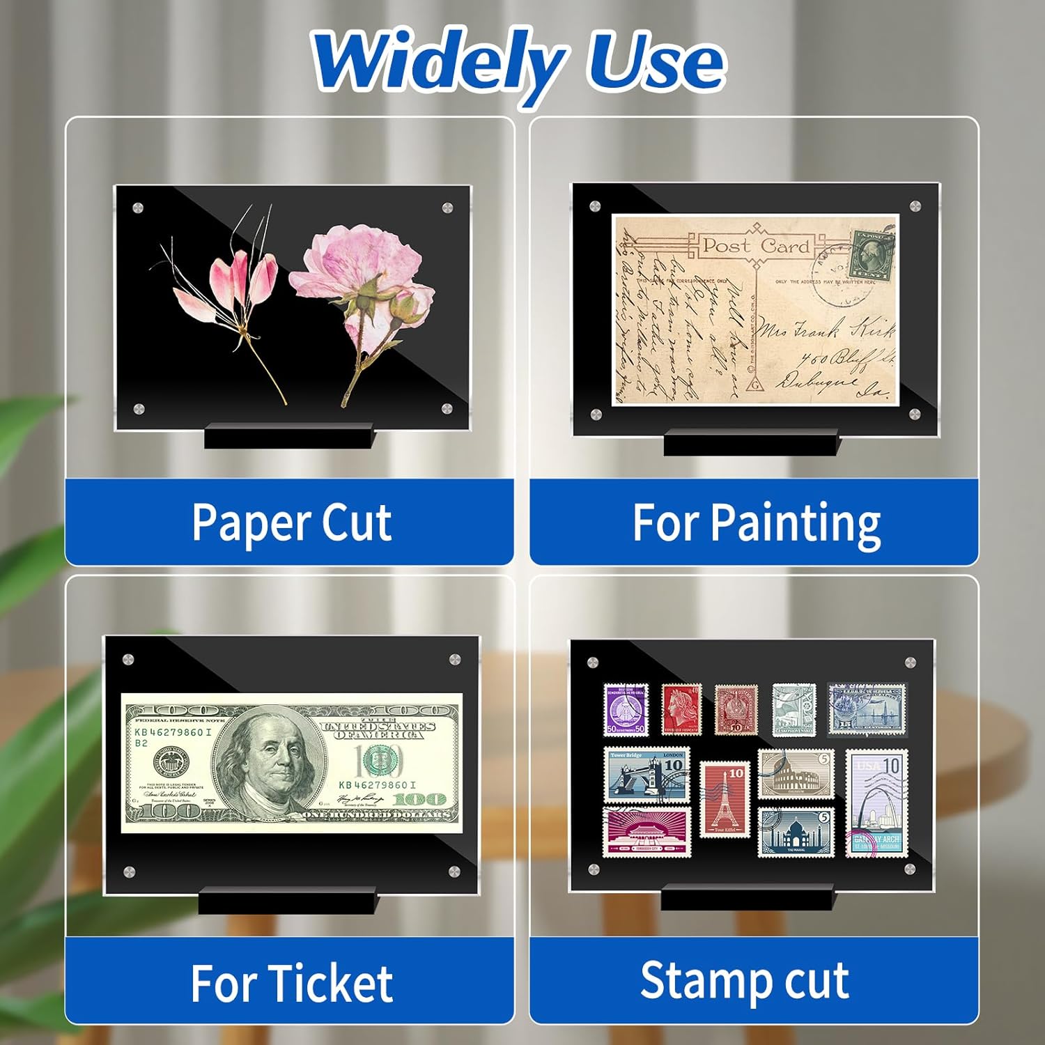 - Black Border Visual:With its unique two - acrylic panels design, the transparent front and black back combination gives your photos a professional, framed look. Especially suitable for displaying stamps, art paintings, precious tickets, Paper Cuttings, leaf specimens, postcards, etc