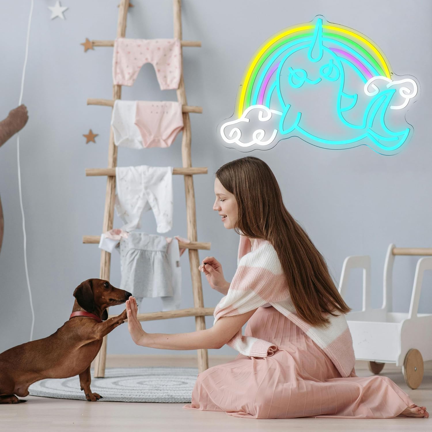 - Unique Design: The Cute blue narwhal image of the rainbow narwhal neon sign is very unique and interesting. The rainbow and the white clouds at its ends symbolise hope, dream and good thing. The narwhal LED sign can create a warm and dreamy atmosphere.