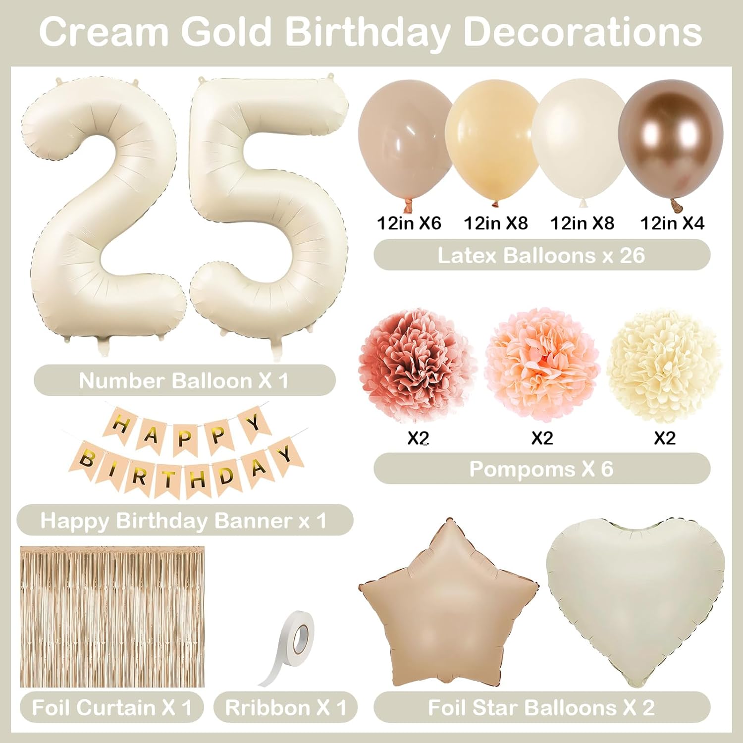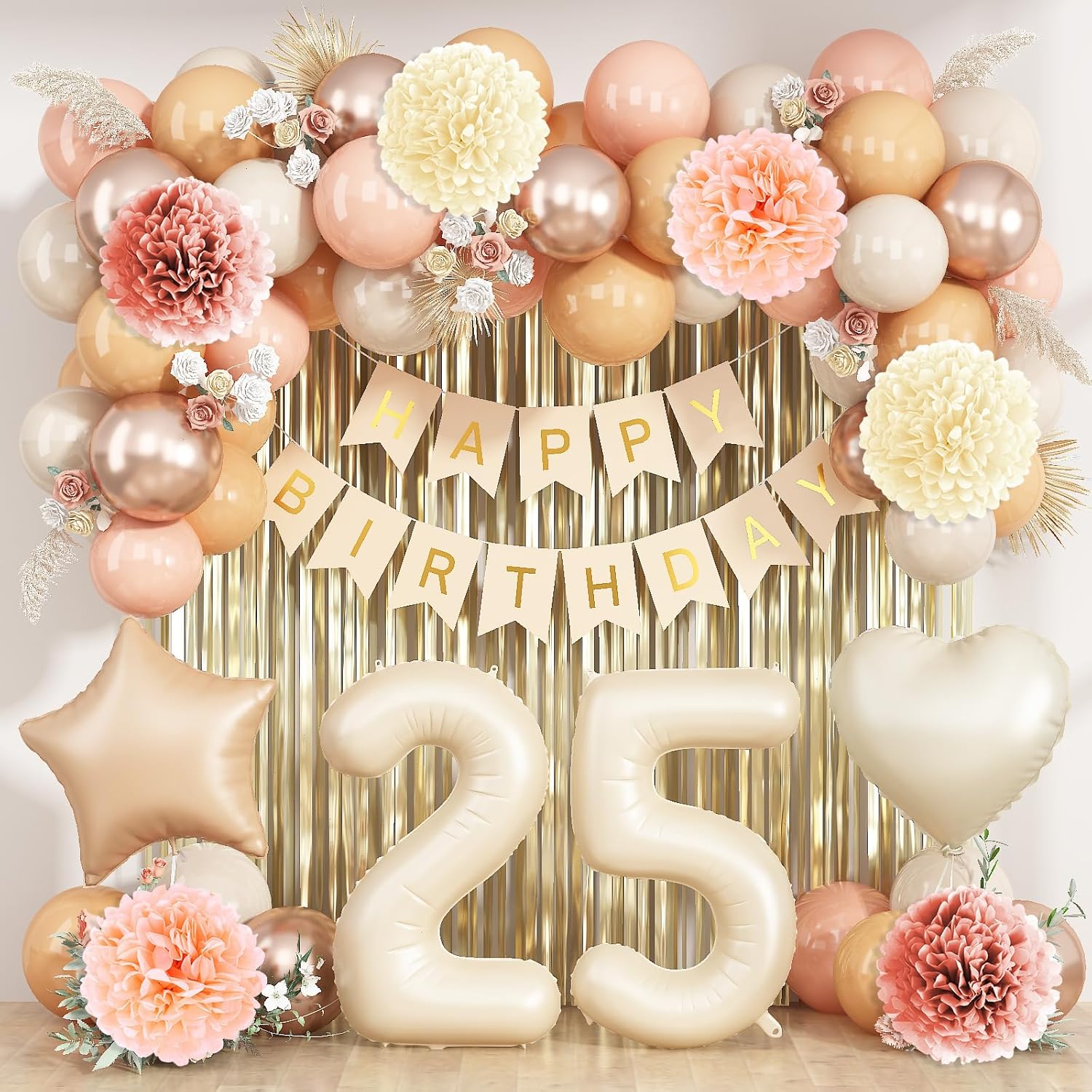 • PACKAGE INCLUDES: 1pc beige 25 number balloon, 1pc happy birthday banner, 2pcs dusty pink paper pom poms, 2pcs blush paper pom poms, 2pcs nude paper pom poms, 1pc champagne gold fringe curtain, 1pc caramel star foil balloons, 1pc cream heart foil balloons, 8pcs nude balloons, 6pcs blush balloons, 8pcs beige balloons, 4pcs champagne gold balloons, 1pc ribbon
