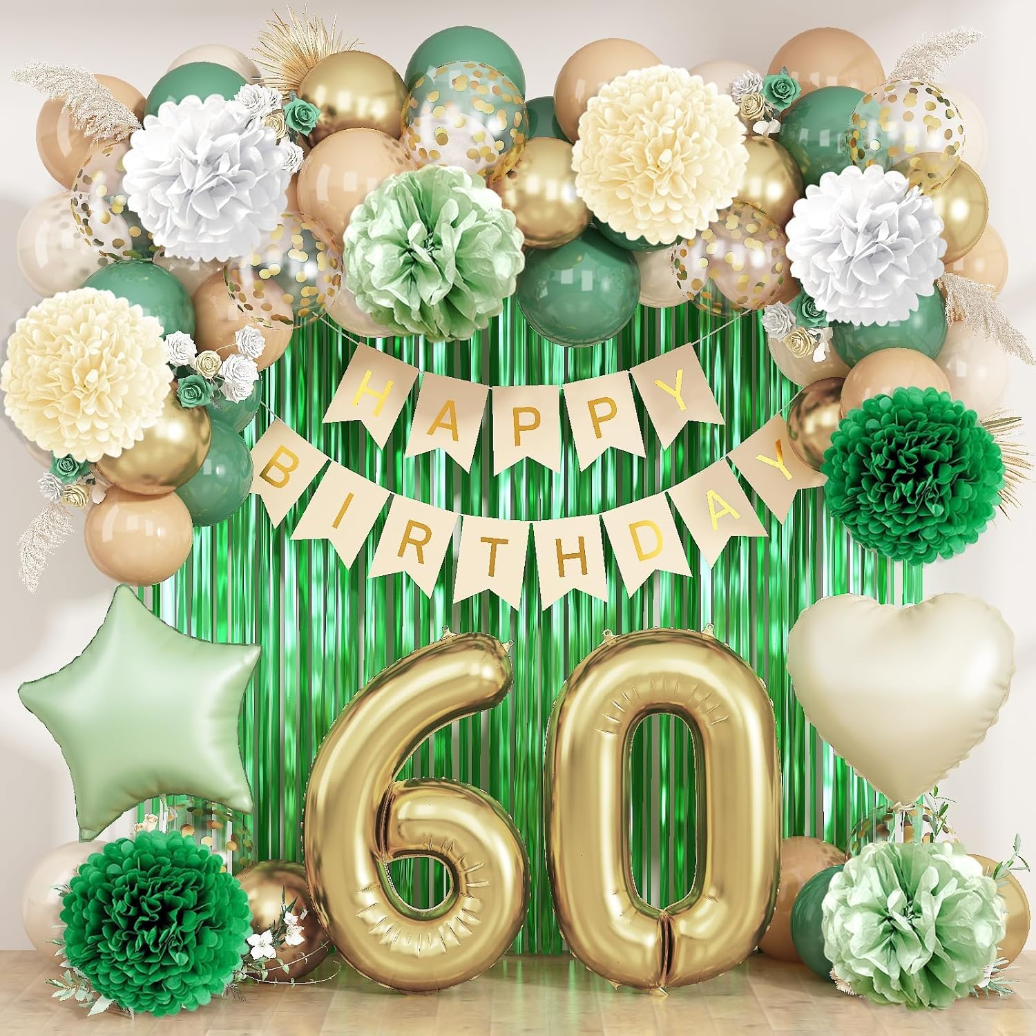- PACKAGE INCLUDES: 1pc gold 60 number balloon, 1pc happy birthday banner, 2pcs deep green paper pom poms, 2pcs sage green paper pom poms, 2pcs nude paper pom poms, 2pcs white paper pom poms, 1pc green fringe curtain, 1pc olive green star foil balloons, 1pc cream heart foil balloons, 6pcs nude balloons, 6pcs sage green balloons, 6pcs beige balloons, 4pcs metallic gold balloons, 4pcs gold confetti balloons, 1pc ribbon