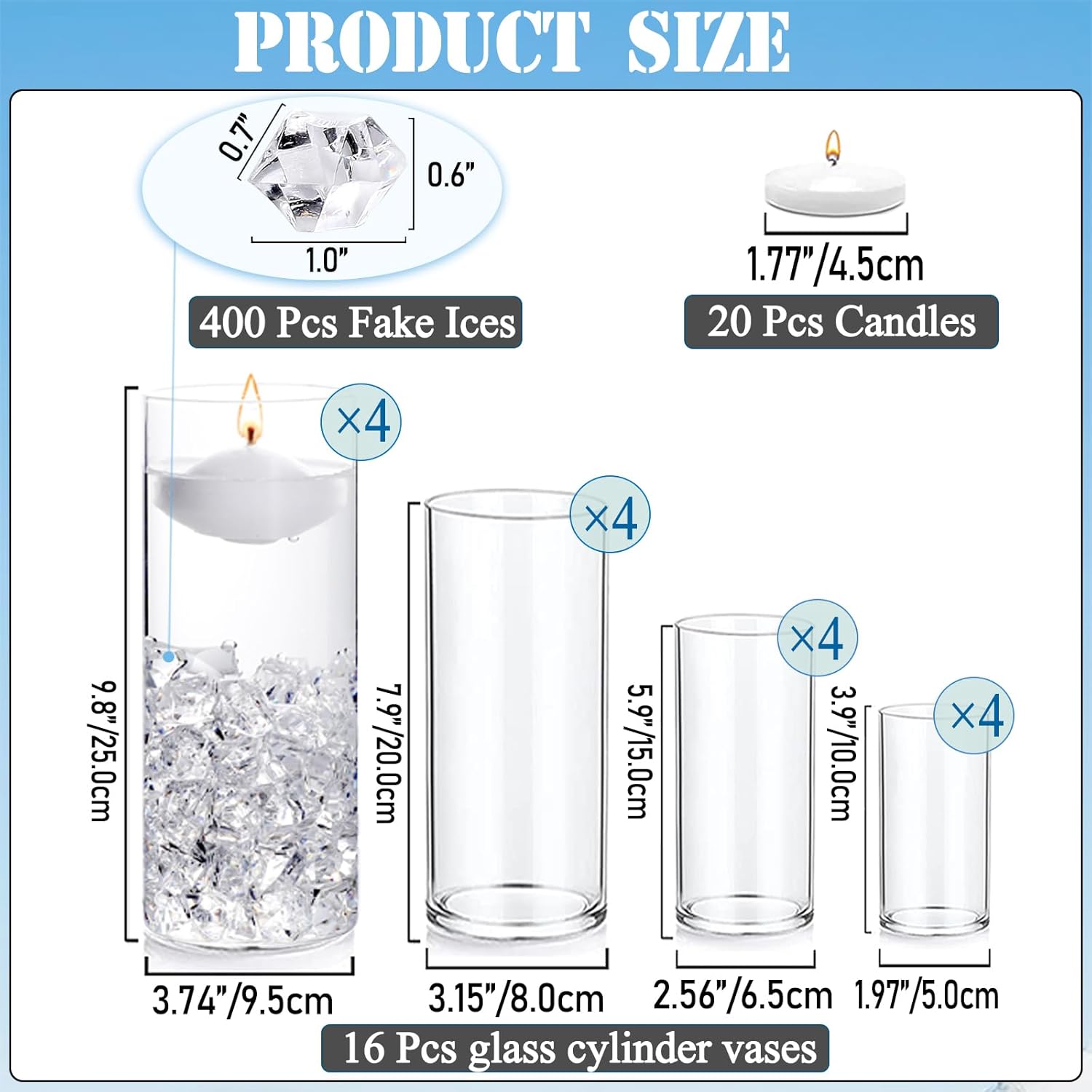 - 【Complete Centerpiece Set】 Includes 16 pcs glass cylinder vases, 20 pcs floating candles, and 400 pcs acrylic fake ice fillers—everything you need to create elegant wedding, party, or home table decorations instantly