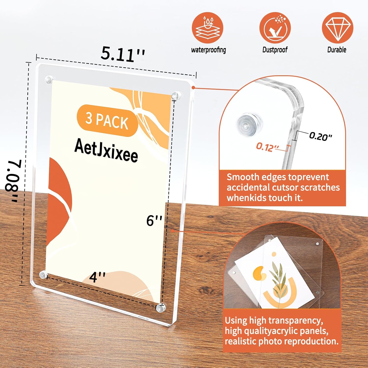 Acrylic Magnetic Picture Frames 4x6 Inch Set of 3, Tabletop and Refrigerator Display Vertical and Horizontal Clear Photo Frames with Detachable Stand for Gift Home Kitchen Decoration