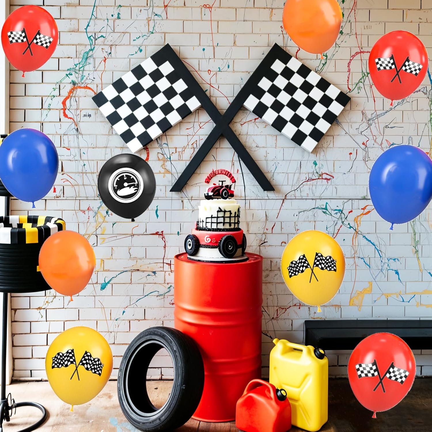 Race Car Balloons, 12 Inch Blue Black Yellow Orange Red Checkered Flag Car Balloons for Boy Race Cars Themed Birthday Graduation Baby Shower Backdrop
