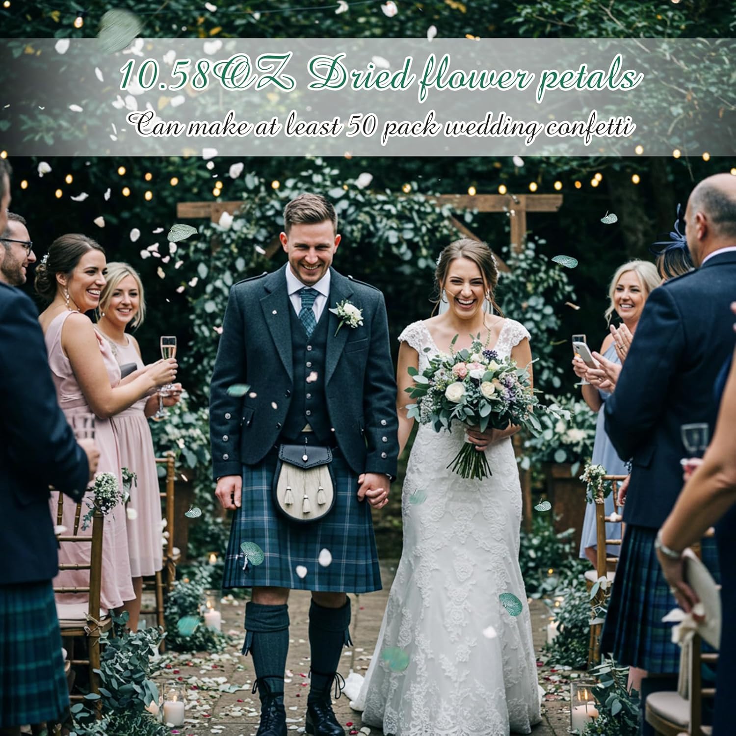- Good Wedding Petal Toss: You will have 10.58 oz eucalyptus leaves confetti petals, enough for about 15 tosses at a wedding and enough for regular table decorations, when you sprinkle them in the air, it forms a beautiful rain of petals and let yourself be in nature at the same time