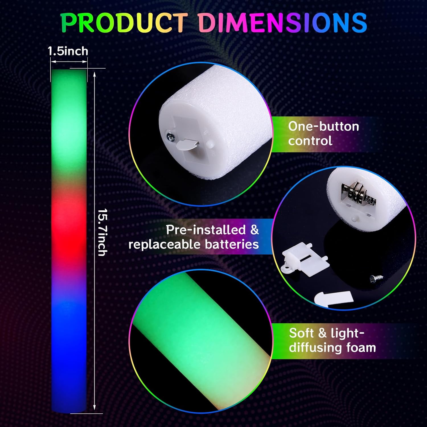 - 100-Pack Multicolor LED Foam Glow Sticks – Bright & Vibrant Party Lights: Each 16 x 1.6-inch glow stick features vibrant red, green, and blue LED lights, creating a stunning neon effect that catches everyone’s attention. Perfect for concerts, raves, weddings, birthdays, festivals, and night events, these light-up wands add energy and fun to any celebration!