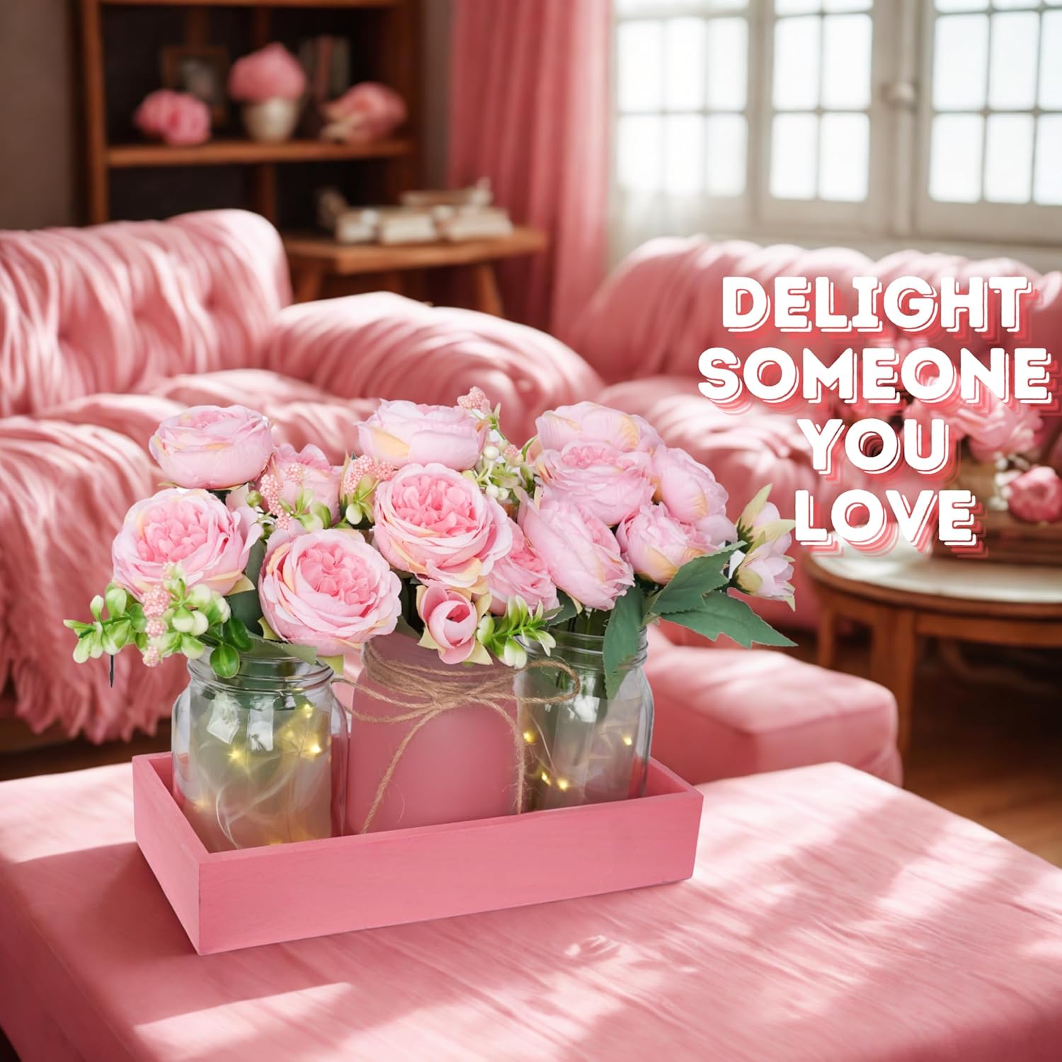 - 【Complete Decor Set】 Package includes: 3 glass mason jars (4.9*2.9 inches each),3 faux peony flowers,a pink-stained wooden tray (11*4.3*2 inches),and 2 starry LED string lights with hexagram light films —unique upgrade for your wedding centerpiece or romantic home setup.