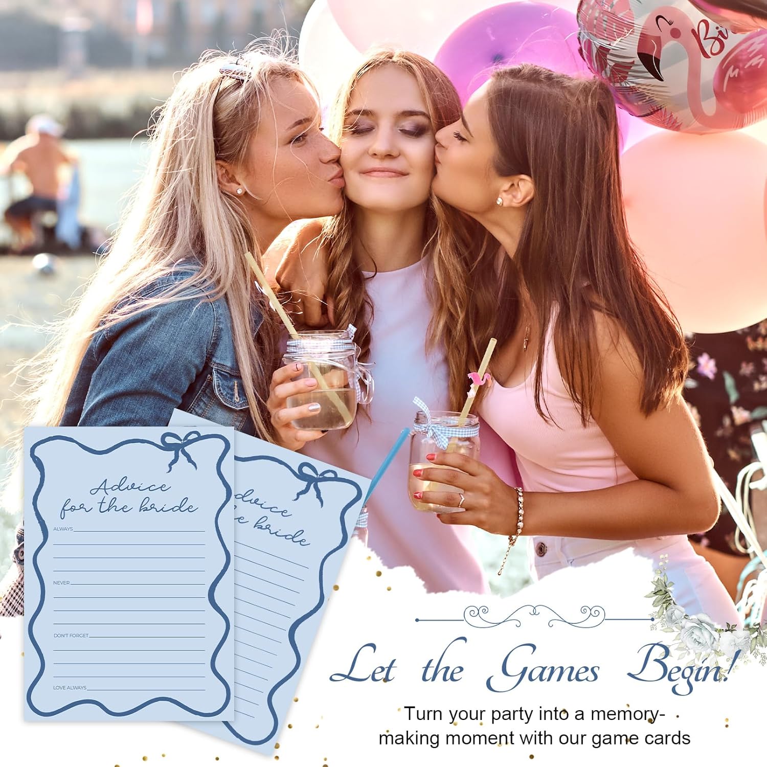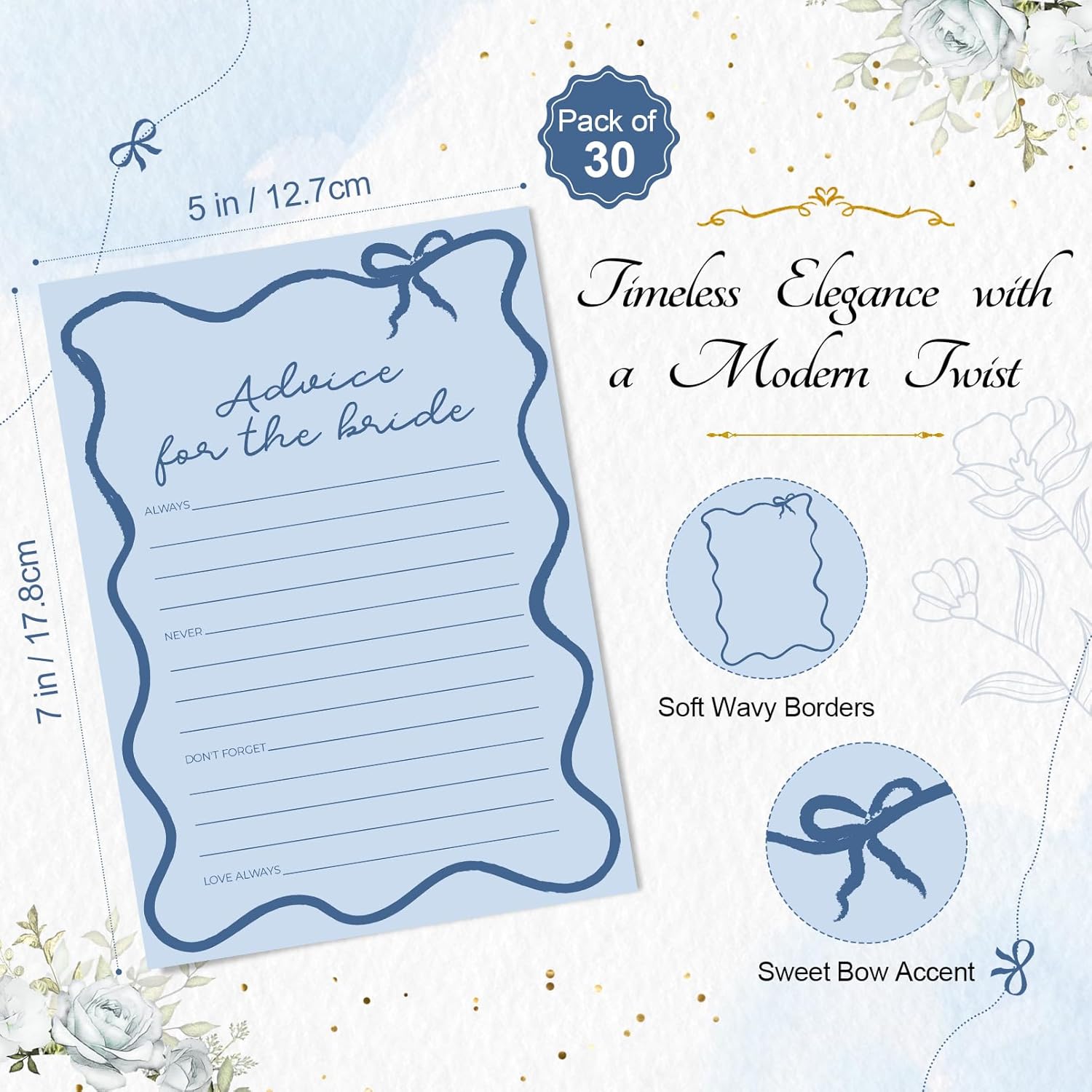 DEEKA 30 PCS Bridal Shower Games Card for 30 Guests Blue Wavy Border Ribbon Bow Funny Wedding Bachelorette Party Games for Reception (Advice for The Bride)