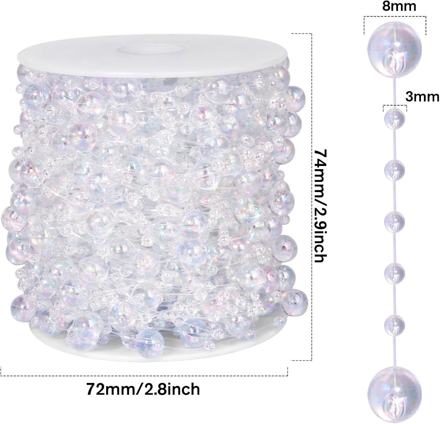 98FT Pearl Beads String Garland, 8mm 3mm Iridescent Faux Pearl Beads Roll Strand Bulk for Wedding Party Flower Christmas Decoration DIY Craft