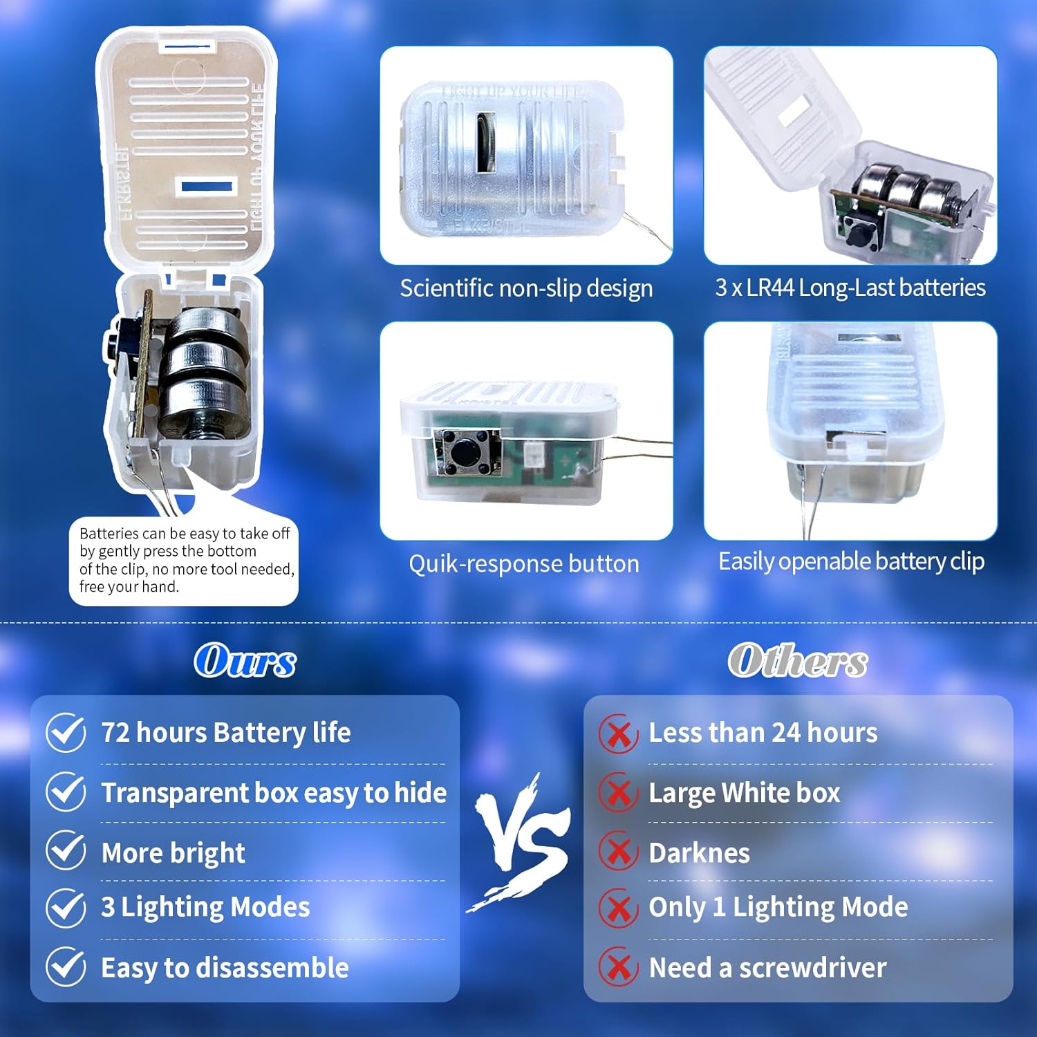 - UPGRADED DESIGH AND EASY TO REPLACE: The fairy lights' newest clear and small battery box is 0.78*1.31 inches in size, very easy to hide into all your DIY projects. The upgraded battery pack has scientific non-slip design on both sides, which makes it feel comfortable and easy to catch. Batteries are also very easy to take off, no more screwdriver needed, just gently press the bottom of the clip to open, free your hand