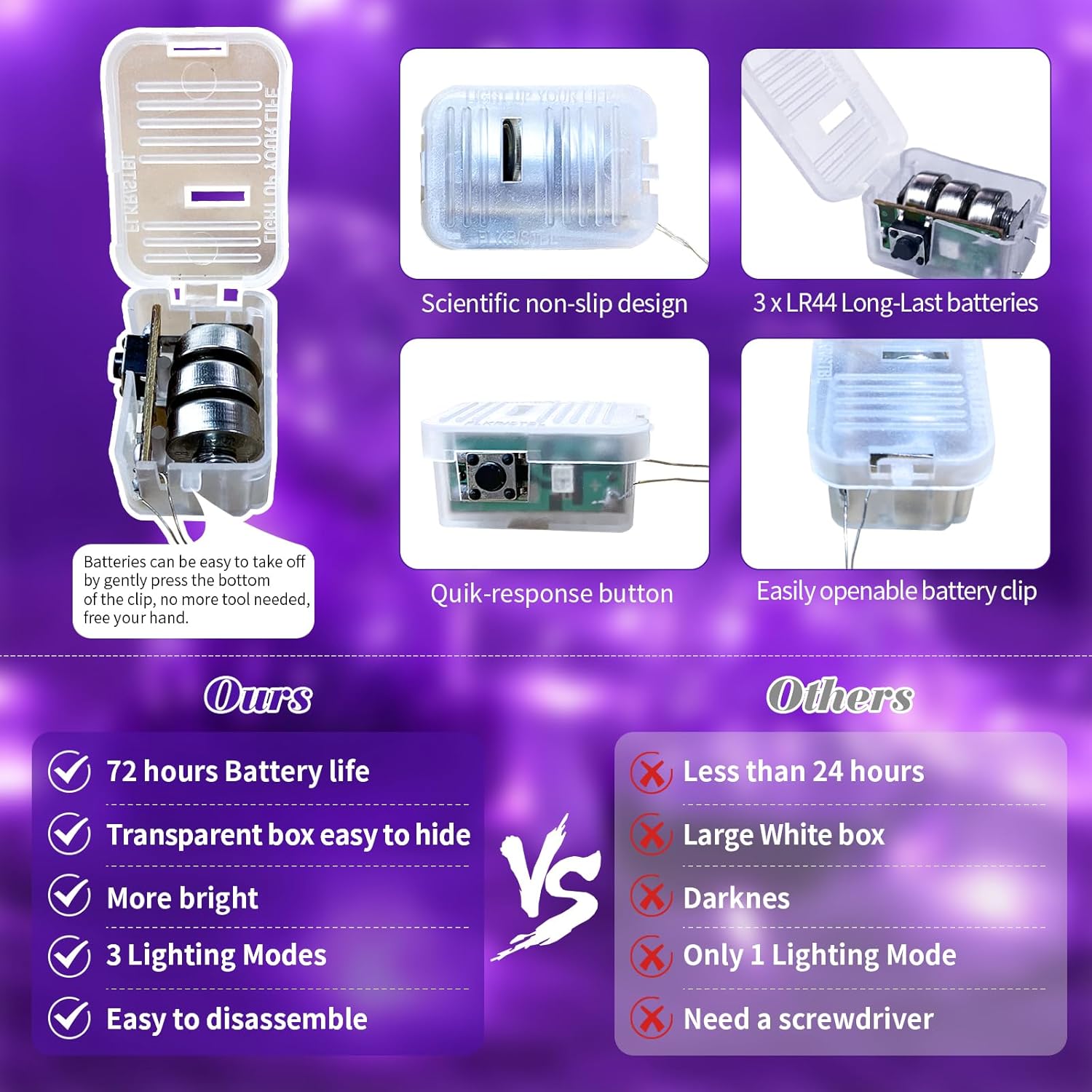- PREMIUM QUALITY AND LONG LAST LIFE: 100 pack in a box, each twinkle lights made of high quality durable 7 feet long flexible silver wire, and 20 energy-efficient mini led fairy lights, 4 inch distance between each led moon lights. This fairy lights battery operated by 3 x LR44 batteries (included), which can provide 101 hours life. This Christmas lights is perfect for both everyday decorations as well as holiday decor (Batteries need to be replaced when the string get dims)