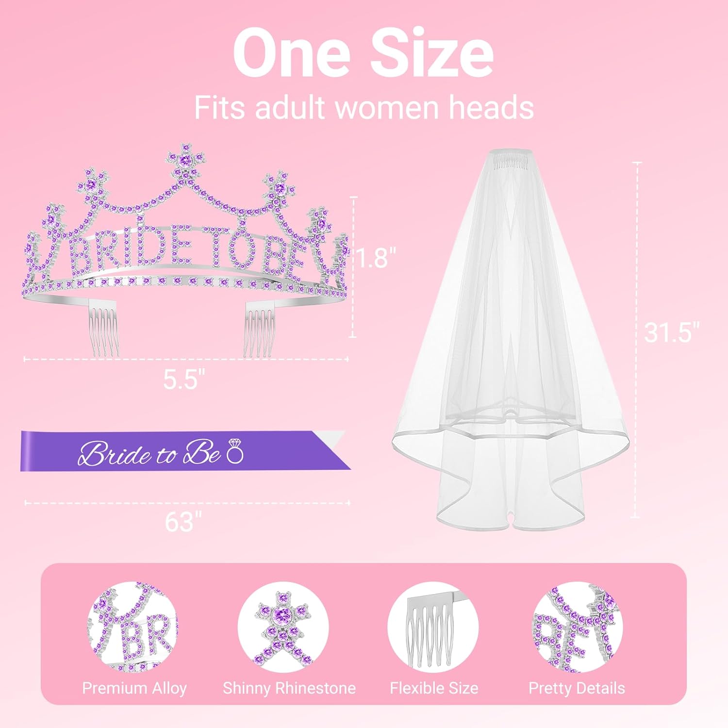 3Pcs Bride to Be Crown with Sash and Veil for Bachelorette Party Decorations,Bridal Shower Accessories for Gift, Favors
