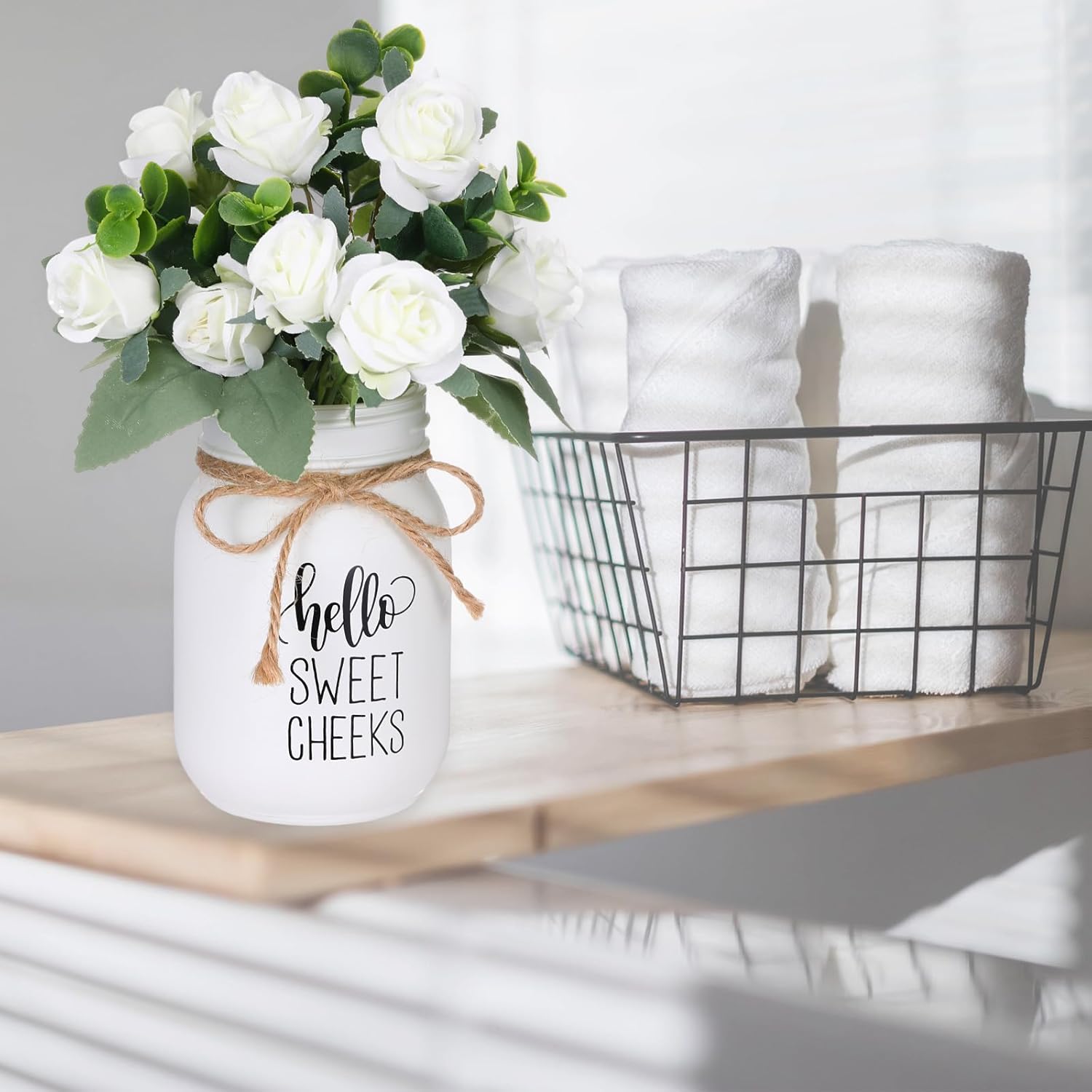XunYee Farmhouse Bathroom Decor Hello Sweet Cheeks Sign Mason Jar with Flowers 16.9 oz White Mason Jar Centerpiece Table Rustic Decor for Restroom Bathroom Shelf Bridal Shower Kitchen