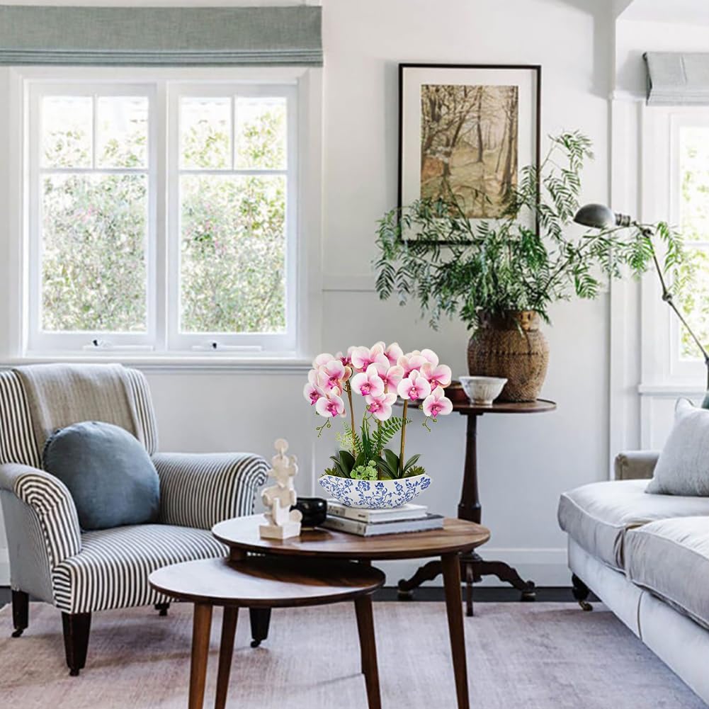 - Dimensions: Standing 18 inches high, the pink orchid flower arrangement includes a ceramic boat-shaped blue and white floral pattern vase that measures 12 inches in diameter, making it an ideal size for various decor settings in both home and office environments. Note: Size shown reflects the arrangement after full expansion. Please allow a 1-2 cm error due to manual measurement.