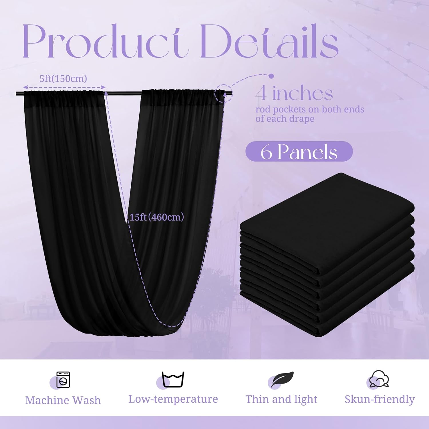 - 【Package Includes】The package will include 6 panels Black wedding ceiling drapes (Not include stand), each wedding extra long curtain measures 5 feet (60inch)wide x 15 feet(180inch) long.The sufficient quantity can meet your demands for decorating your weddings, parties, receptions.