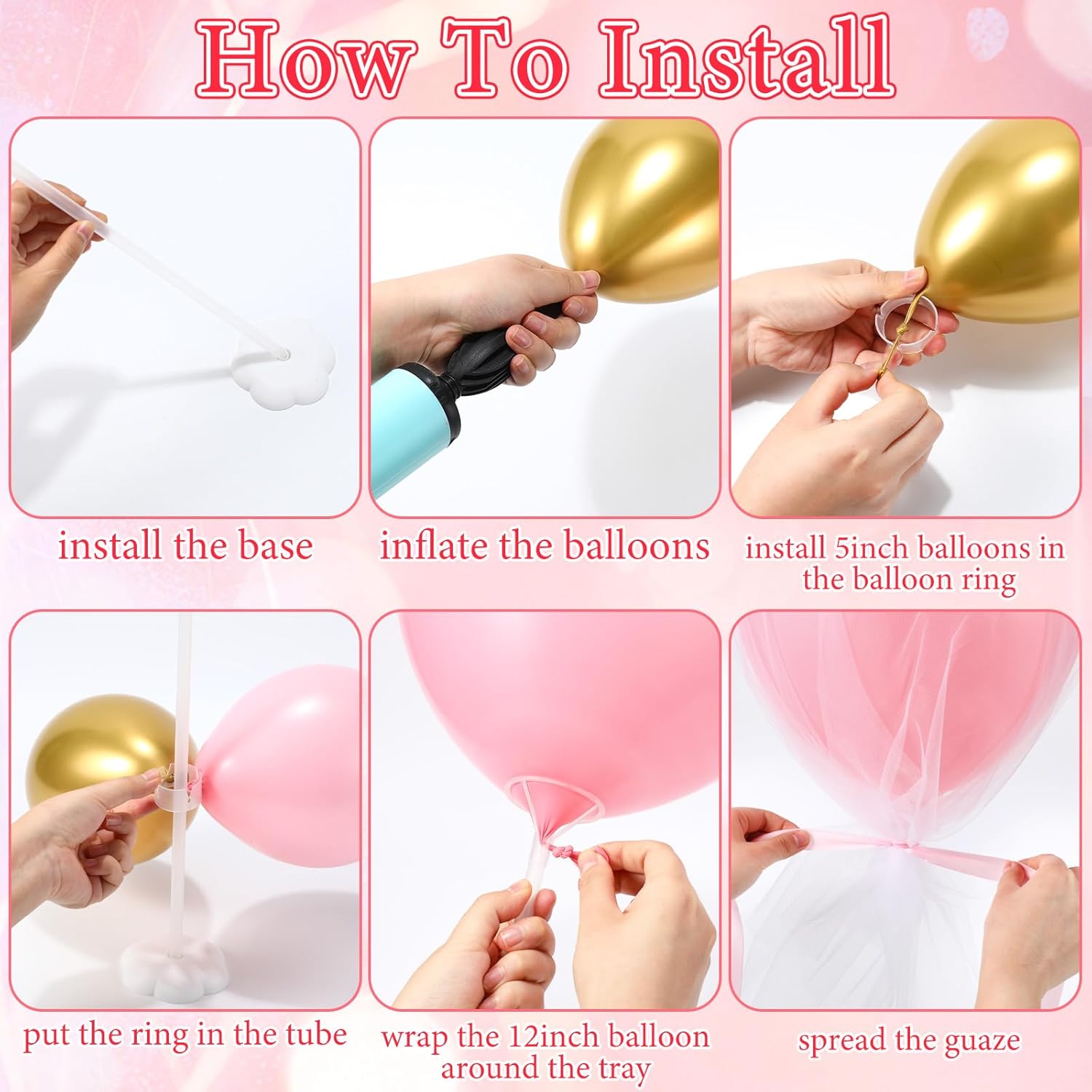 - What You Get: you'll receive a nice value balloon pack that includes 8 reusable tabletop balloon sticks, 8 balloon bases, 16 round snaps, 8 white gauze covers, 8 balloon fixed holders, 72 pieces of 5 inch latex balloons (36 bright pink and 36 gold), 8 pieces of 12 inch macaroon bright pink latex balloons and 8 pieces pink thick ribbons; Please note that the color will be closer to the picture after inflated