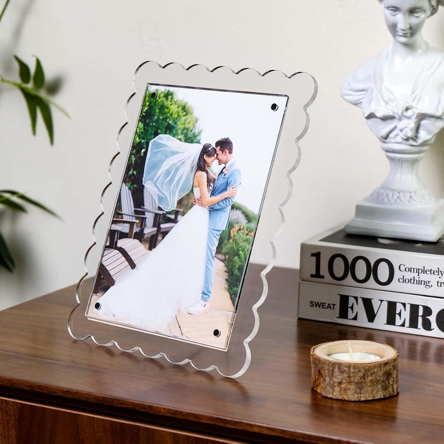- Crystal Clear & Durable: Shatterproof, UV-resistant acrylic keeps your pictures sharp and protects them from fading or yellowing. The frameless, scalloped design makes photos pop.