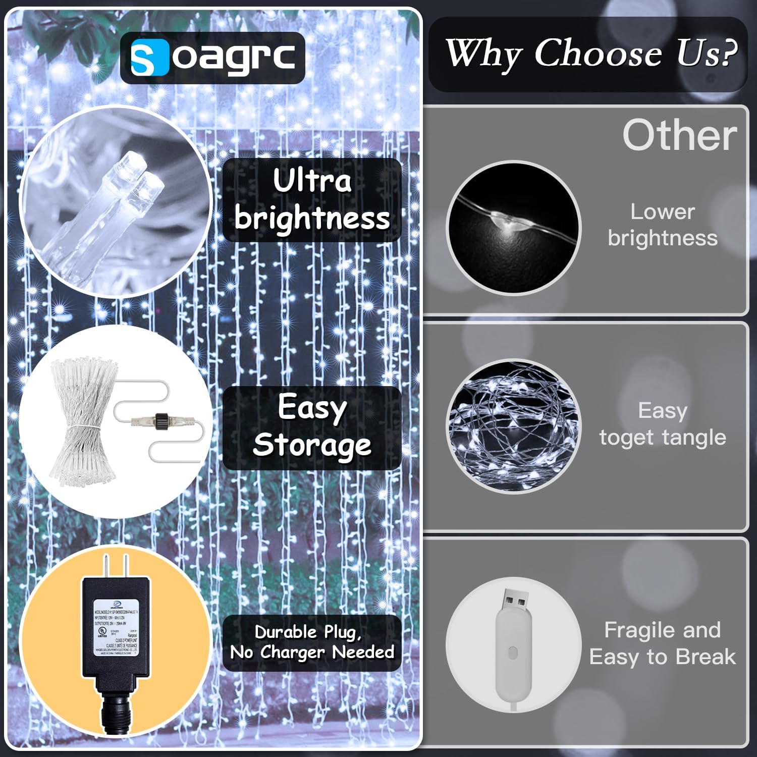 - Upgraded Durability for Everyday Use - Soagrc curtain string lights are crafted with enhanced copper wire and high-quality LEDs to ensure stronger durability. Tangle free and stable, theyโre ideal for everyday use from dressing up your bedroom wall to adding a soft glow behind your reading nook or vanity mirror