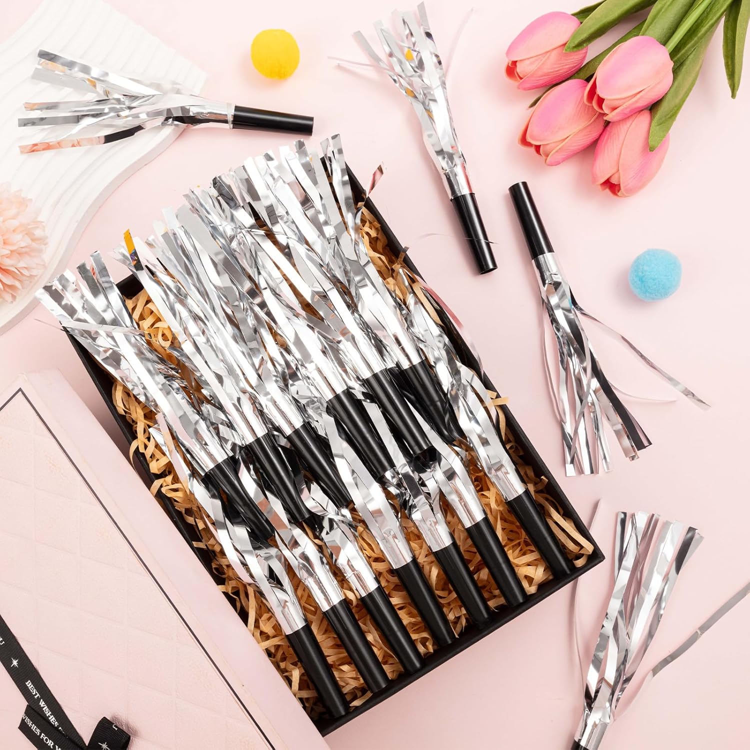 - PACKAGE INCLUSION : You will receive 36 sparkling silvery glitter party blowers,with eye-catching colors and interesting sounds.. These noise makers are good for birthday parties, celebrations, and more