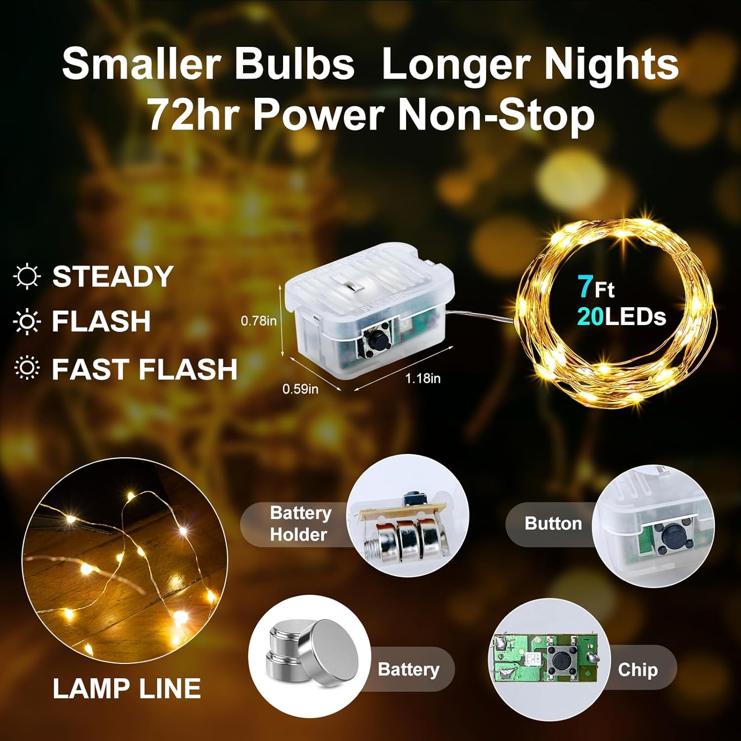 - 【MINI FAIRY WIRE LIGHTS】-- 3 LR44 batteries included in each LED fairy lights,lasting over 72 hours.7 Feet Mini Light String made of high quality silver-plated copper wire,which makes led moon lights sturdy and durable.Battery box measures 0.78*1.2in,easy to hide in all your DIY decorating projects.