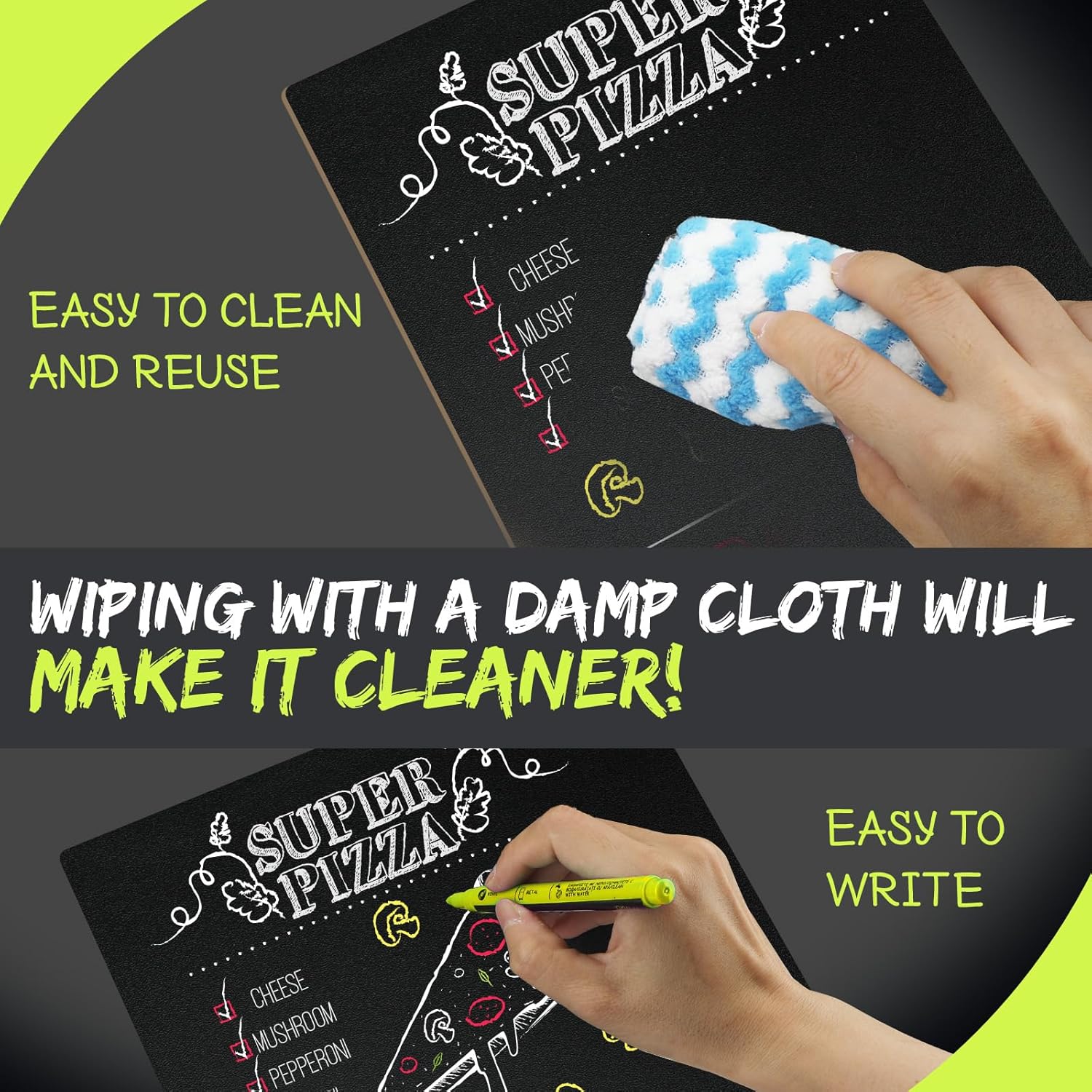 - ♥EASY TO CLEAN: Our menu board surface is made from professional blackboard material, allowing for reusable, erasable marker pen writing. After the marker has dried after creation, a dry rag is not easy to wipe and will make the artwork last. A wet cloth wipes the surface and can be easily erased!