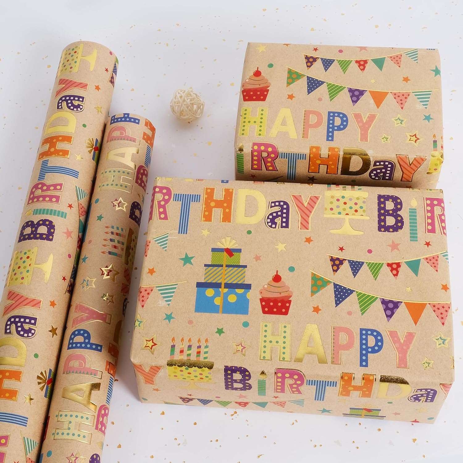 Aimyoo Colorful Birthday Wrapping Paper Roll - 17 Inch X 16.4 Feet - Gold Foil Happy Birthday Lettering, Cupcake & Flags Design Gift Wrap for Kids, Baby Showers