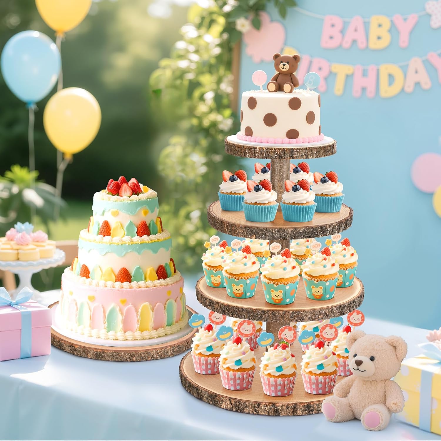- Rustic cupcake tower ๏ผ cupcake tier stand Made from natural Paulownia wood, the cupcake stand retains the real bark, and each wooden tray has annual ring wood grain, woodland themed party must haves for hosting