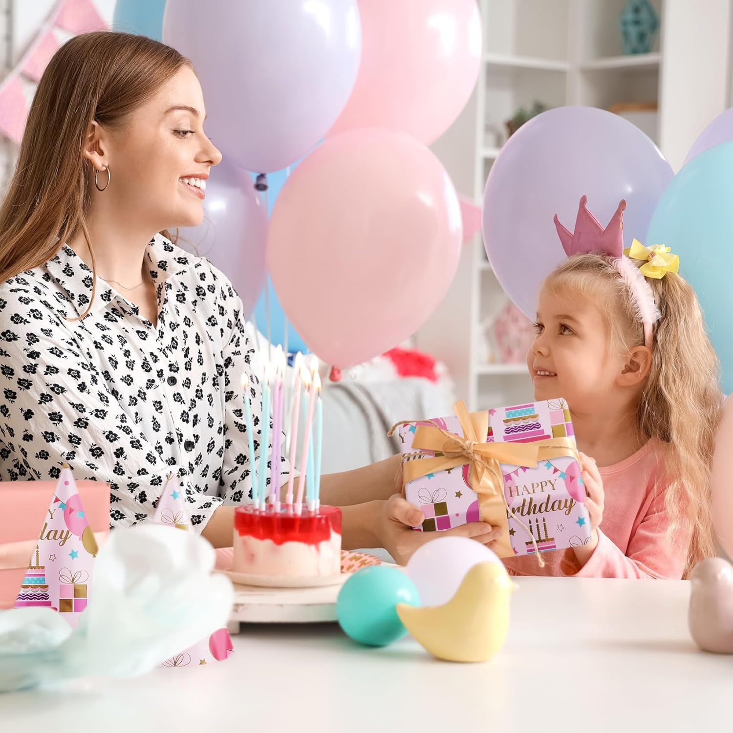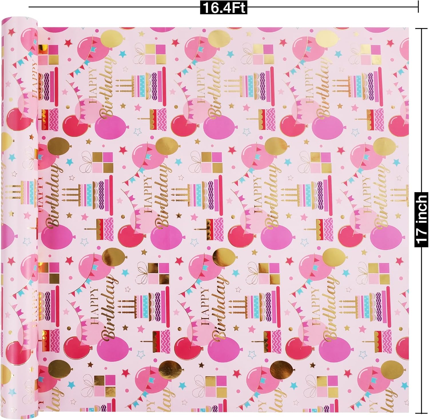 Aimyoo Pink Birthday Wrapping Paper Roll - 17 Inch X 16.4 Feet - Gold Foil Celebration Cake, Balloon, Happy Birthday Lettering Design Gift Wrap for Kids, Baby Showers