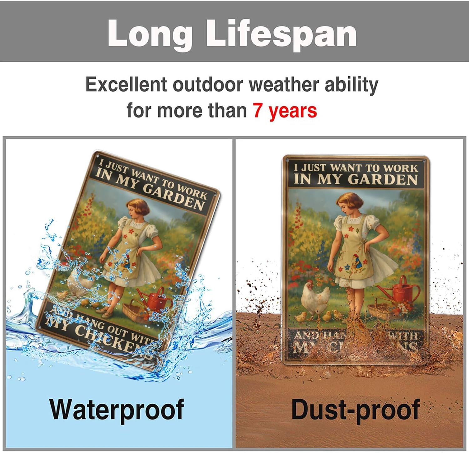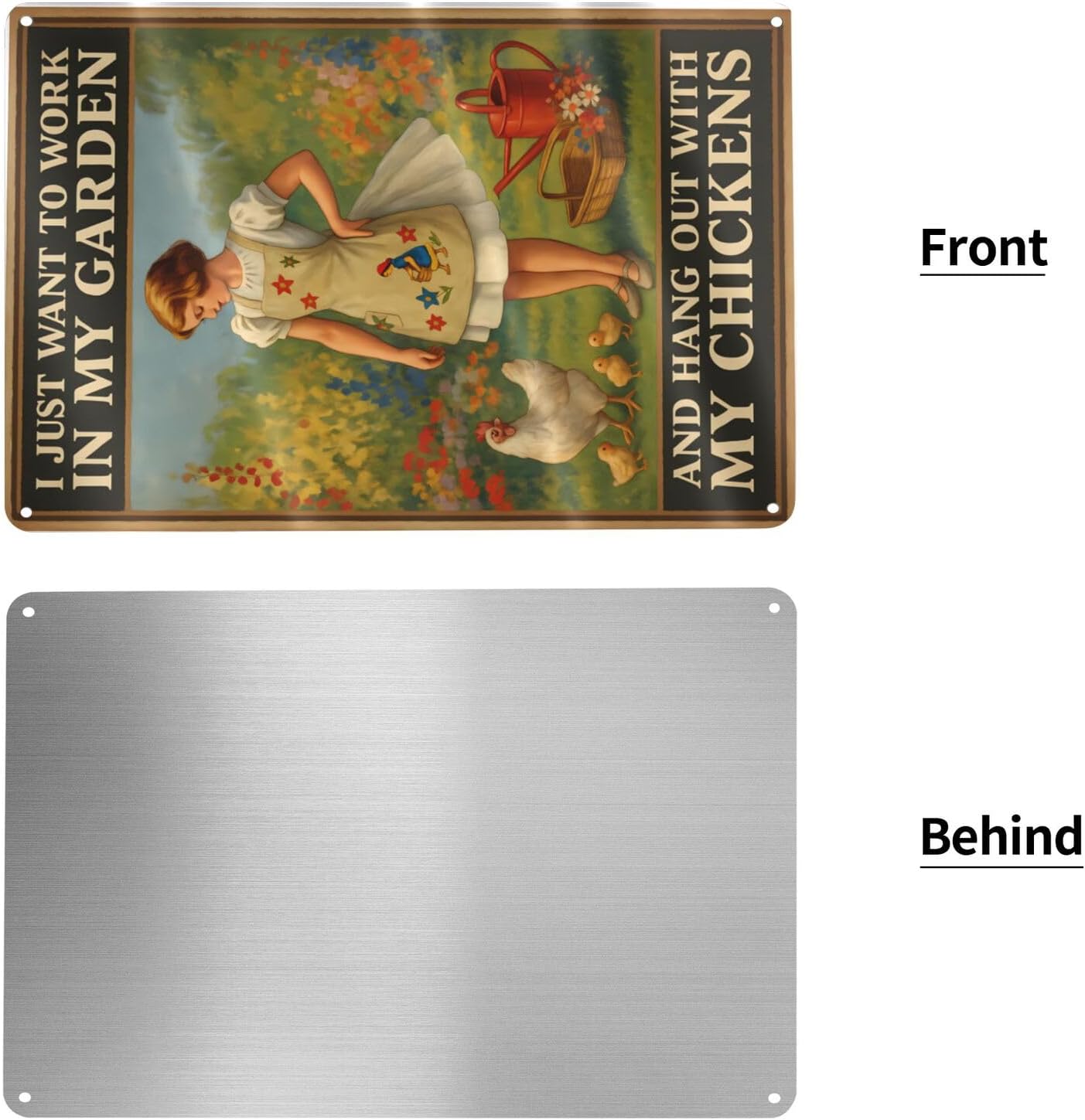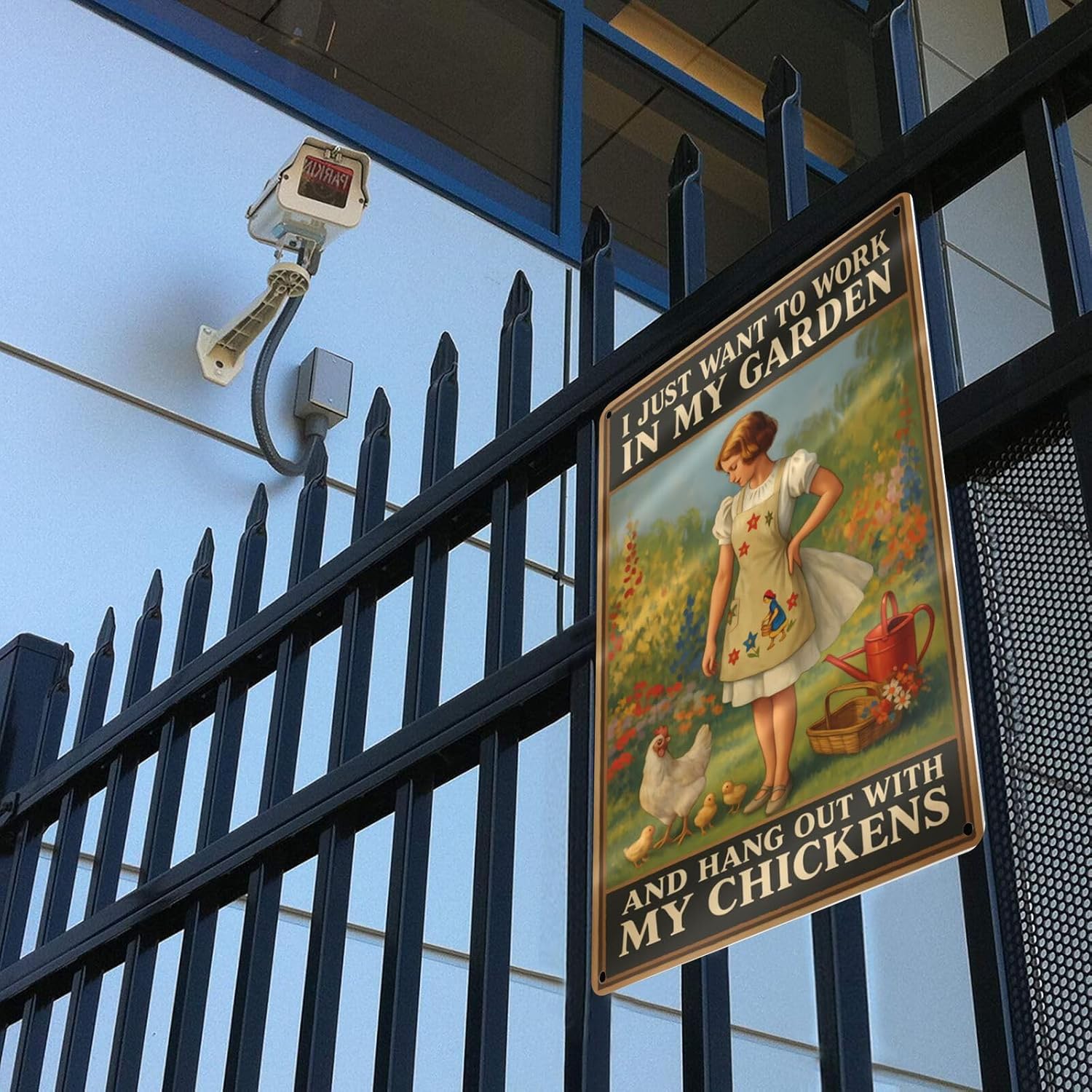 Funny Garden & Chicken Coop Sign - "I Just Want to Work in My Garden and Hang Out with My Chickens" Rustic Metal Wall Decor for Farmhouse, Backyard