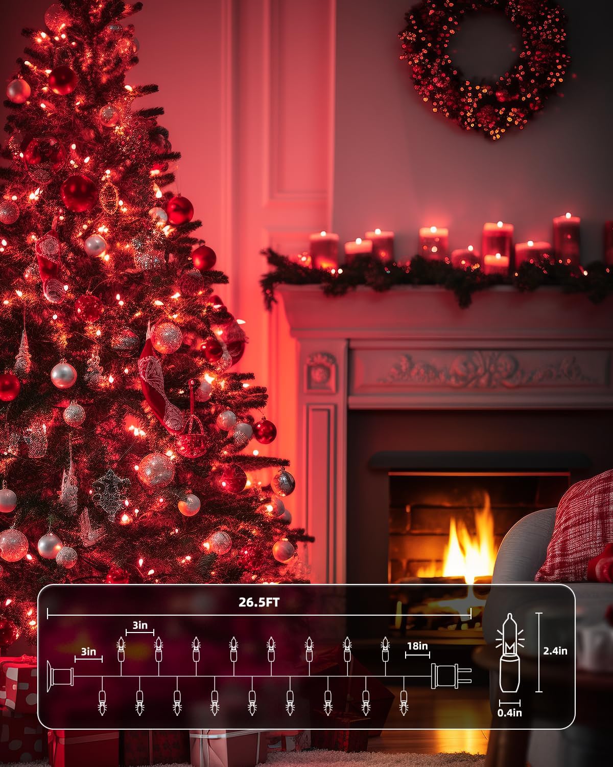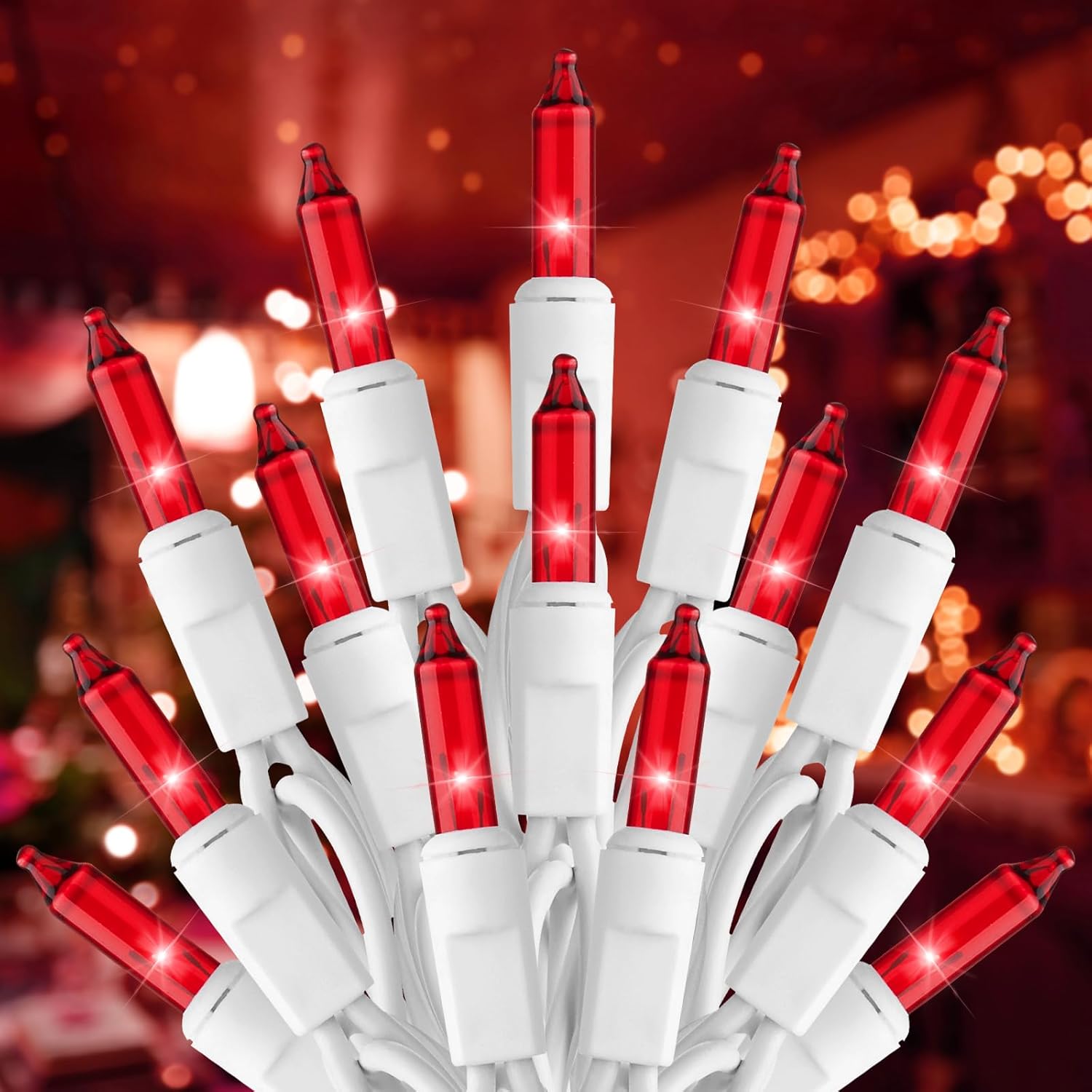 - 【Festive Mini Christmas Lights Set】This set includes 100 red incandescent mini-lights on 26.5 ft white wire, with bulbs spaced 3-inche apart and 18-inch lead wire. Perfect for holiday decorating, with the ability to connect up to 5 light strings end-to-end;