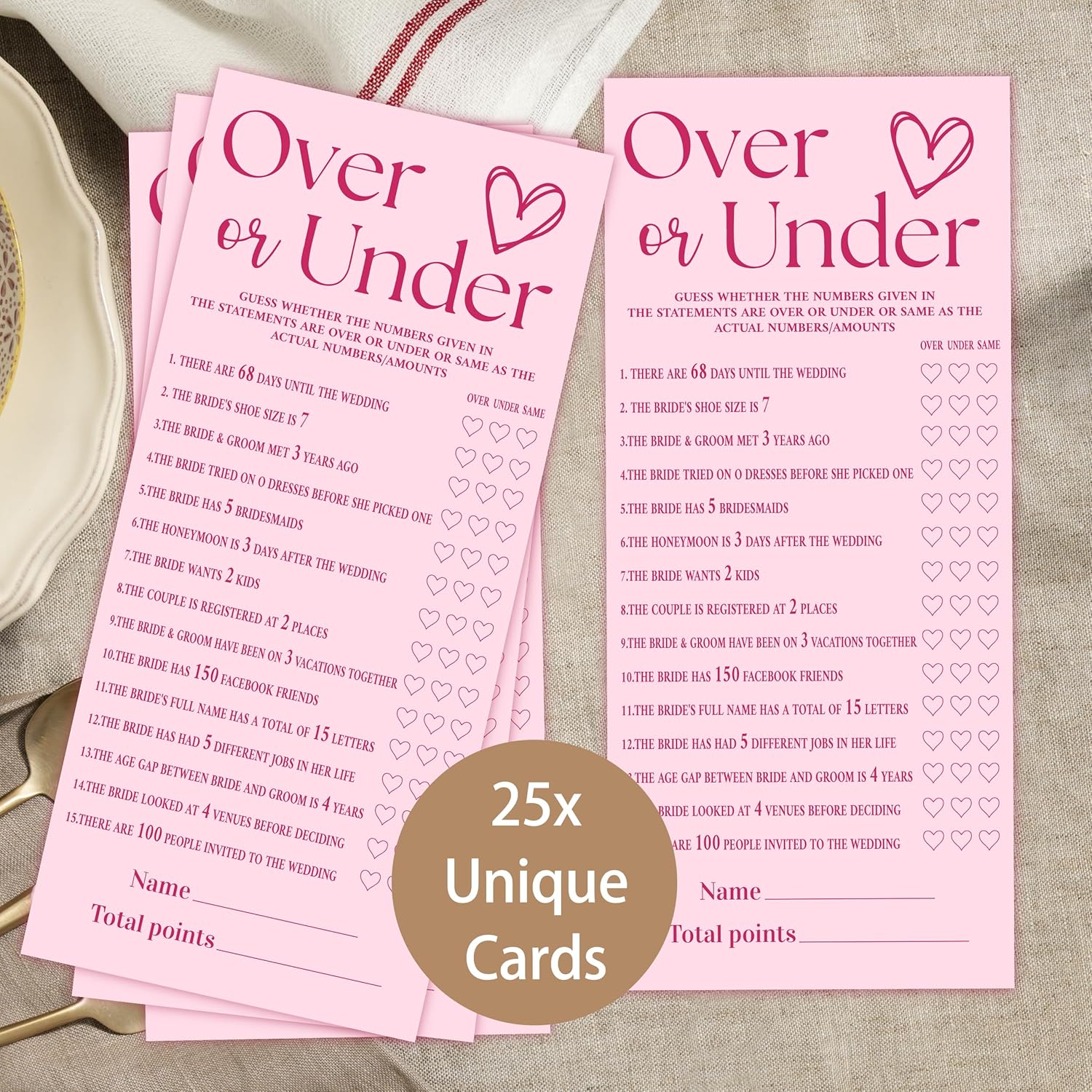 4x9 Inch Wedding Shower Games Cards, Over or Under, Pink Bridal Shower Games for 25 Guests, Engagement Party Supplies, Wedding Party Supplies Decoration-A01