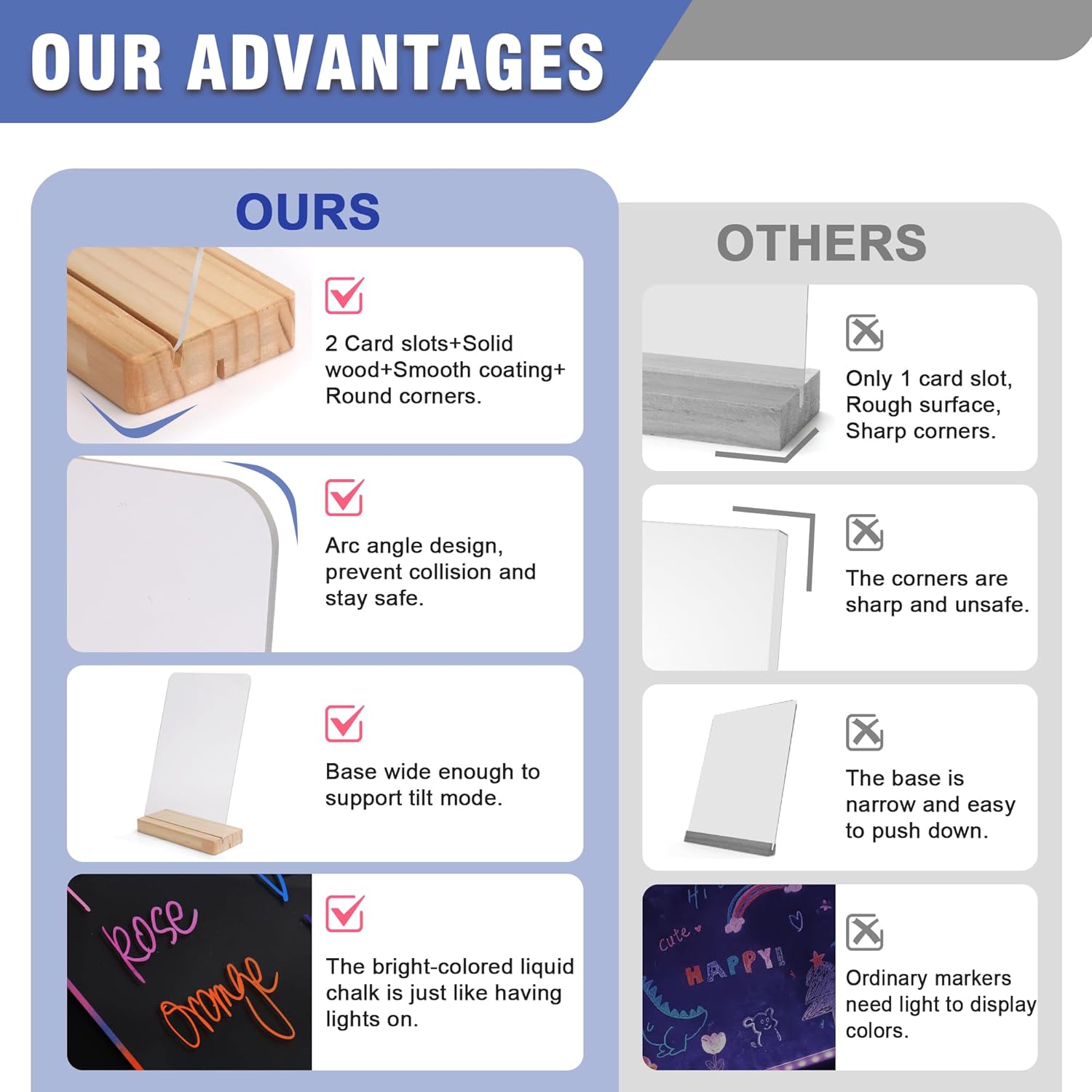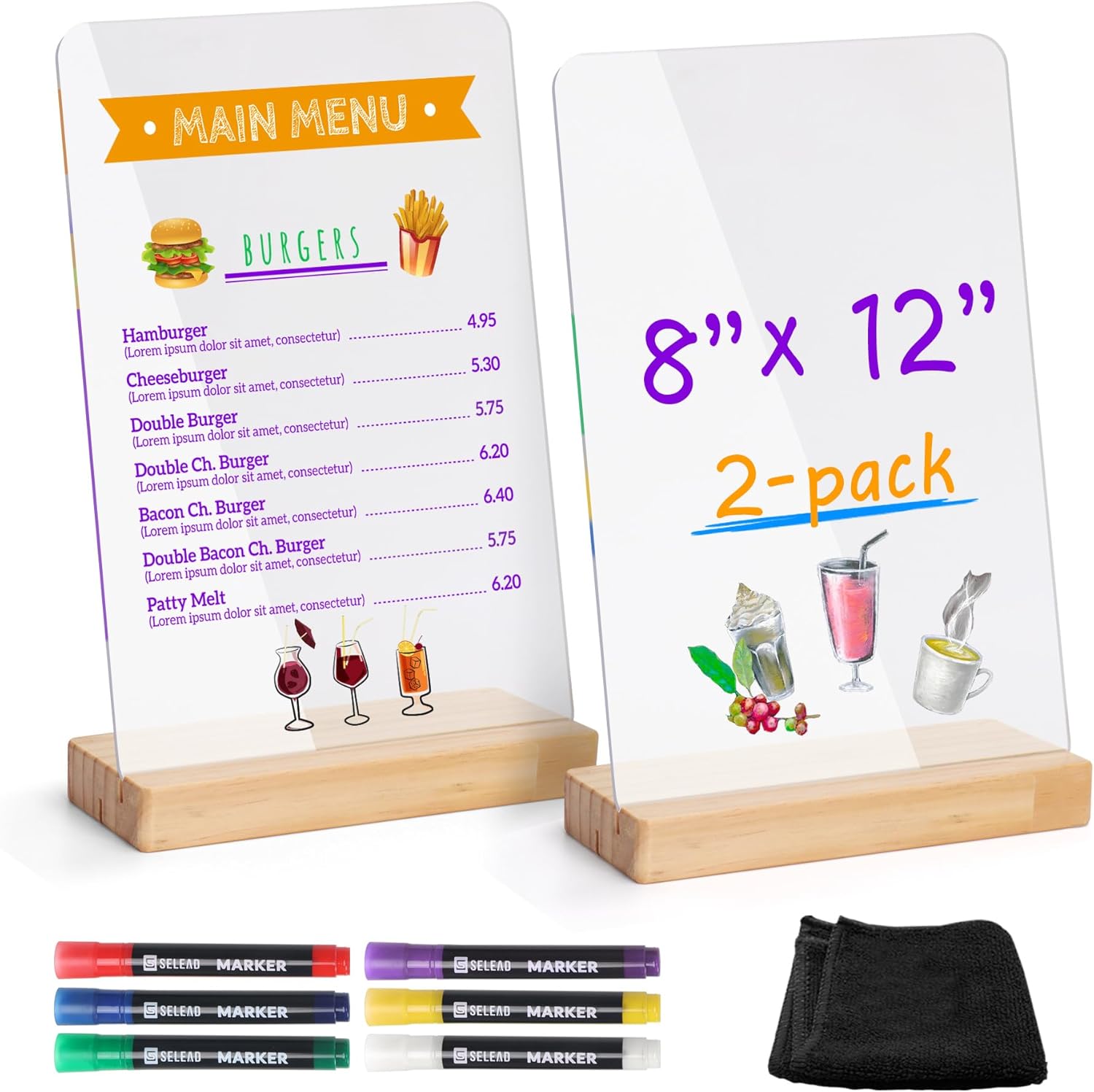 - 🌈【ALL INCLUDED】 2 Pack 8” x 12” Acrylic Sign Board: 2pcs Acrylic Boards + 2pcs Wood Base + 6pcs Bright Color Liquid Chalk Markers + 1pc Black Cloth. One purchase, All in place!