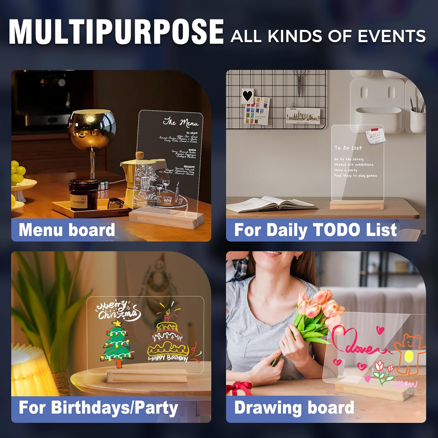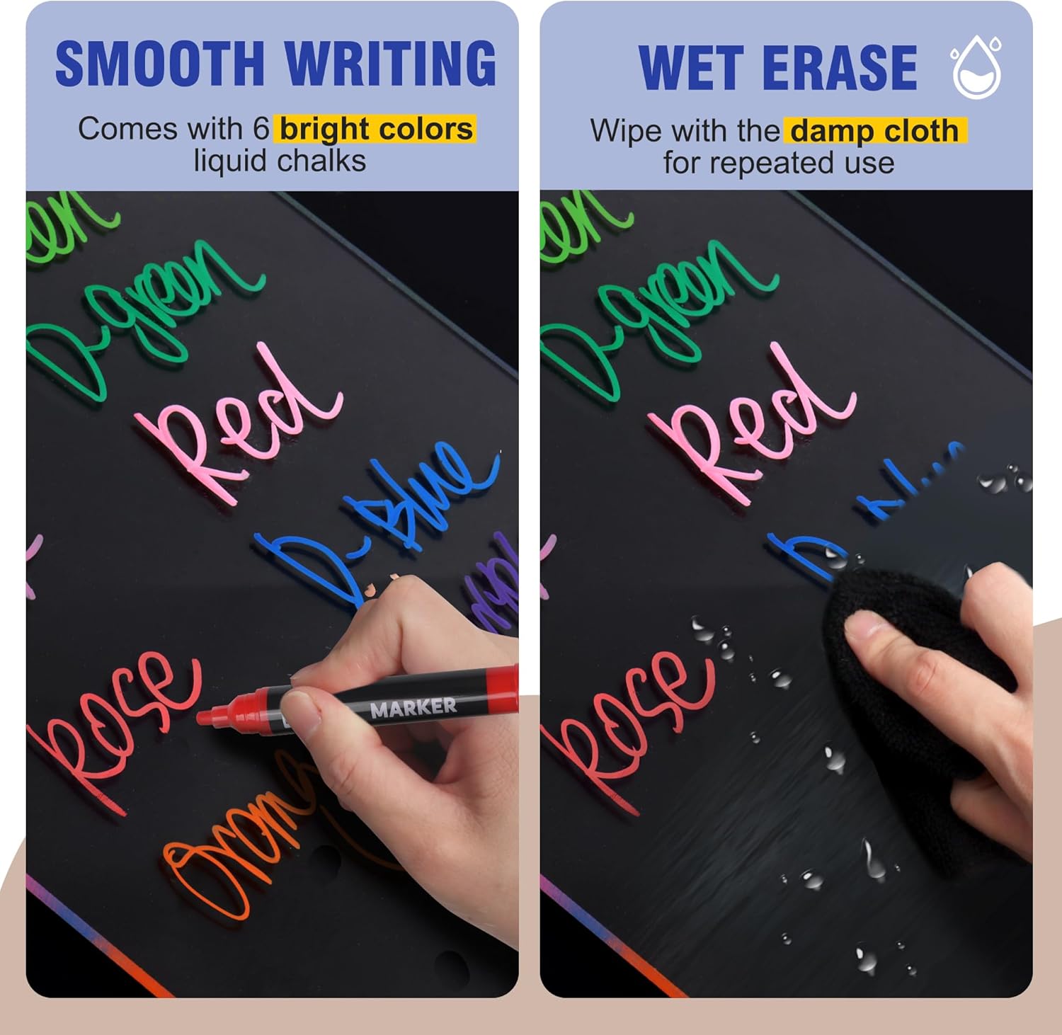 - ✍️【EASY TO WRITE AND WET WIPE】 Double-sided acrylic board available for smooth writing. Our sign board supports liquid chalk, dry erase marker writing. After writing, it can be easily wiped with a damp cloth (or just rinse this board directly), leaving no marks.