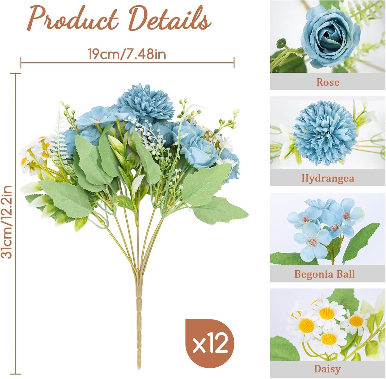 12 Bundles Artificial Flowers Blue Fake Rose Flower Mixed Chrysanthemum Hydrangea Flower Arrangements for DIY Wedding Table Centerpieces Party Baby Shower Home Decorations