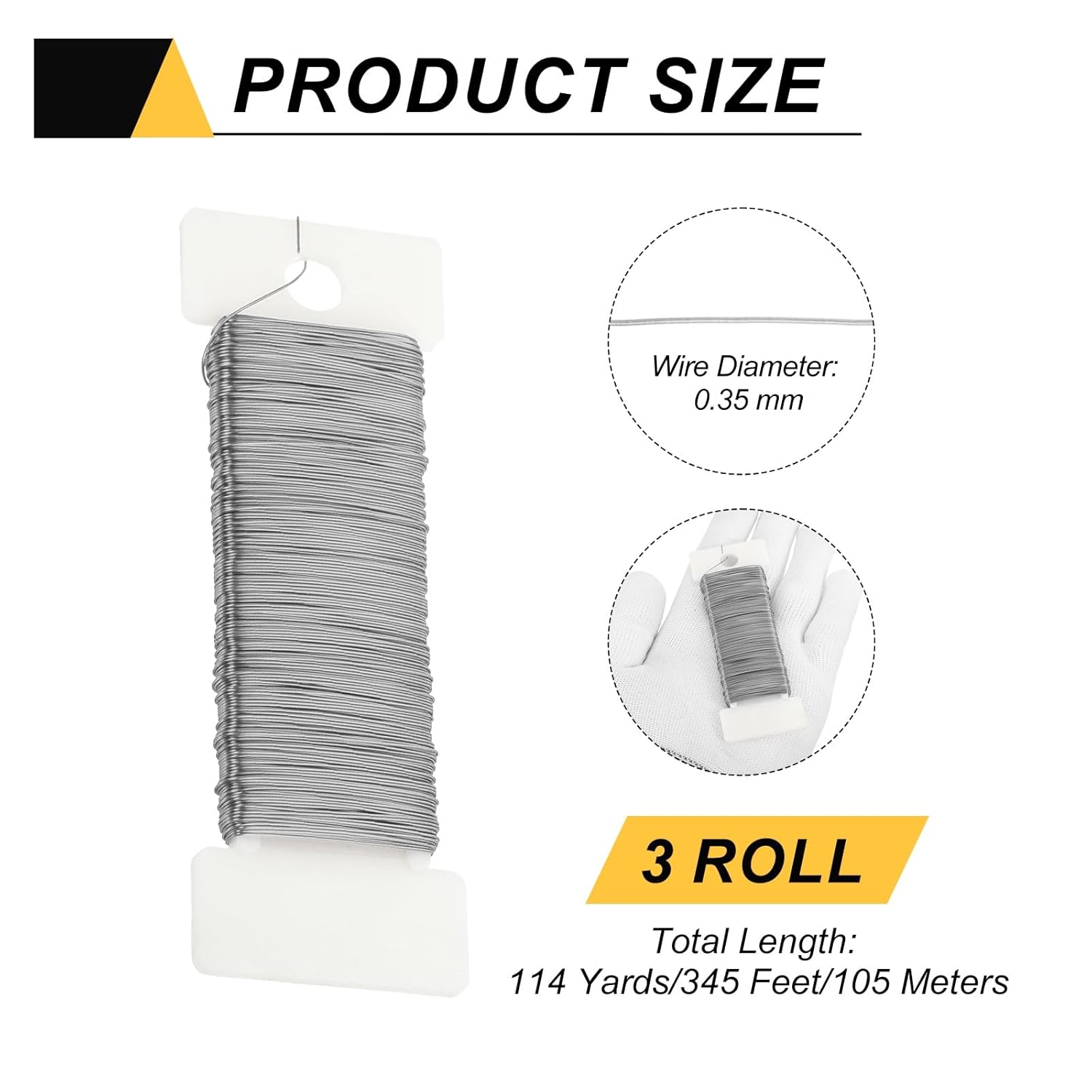 - Color: Silver Tone; Material: Aluminum; Total Length: 114 Yards/345 Feet/105 Meters; Diameter: 0.35mm/27 Gauge; In the package of: 3 Roll Metal Floral Wire (38 Yards/ Roll)