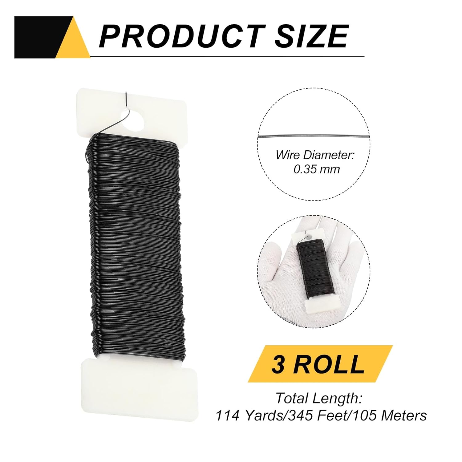 - Color: Black; Material: Aluminum; Total Length: 114 Yards/345 Feet/105 Meters; Diameter: 0.35mm/27 Gauge; In the package of: 3 Roll Metal Floral Wire (38 Yards/ Roll)