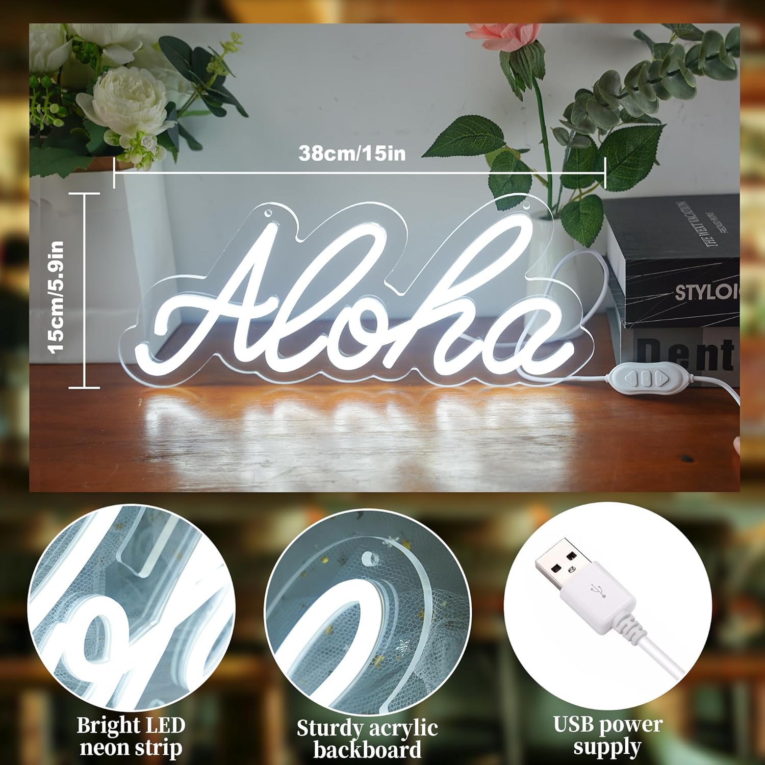 - 【Unique design】The neon Aloha light up sign also includes a standard USB power cord with a dimmer switch, allowing you to adjust brightness as desired. The Aloha Neon Sign is perfect for multiple uses, whether it's used as an accent piece in a bedroom, a conversation starter in a living room, or a creative addition to a home bar.