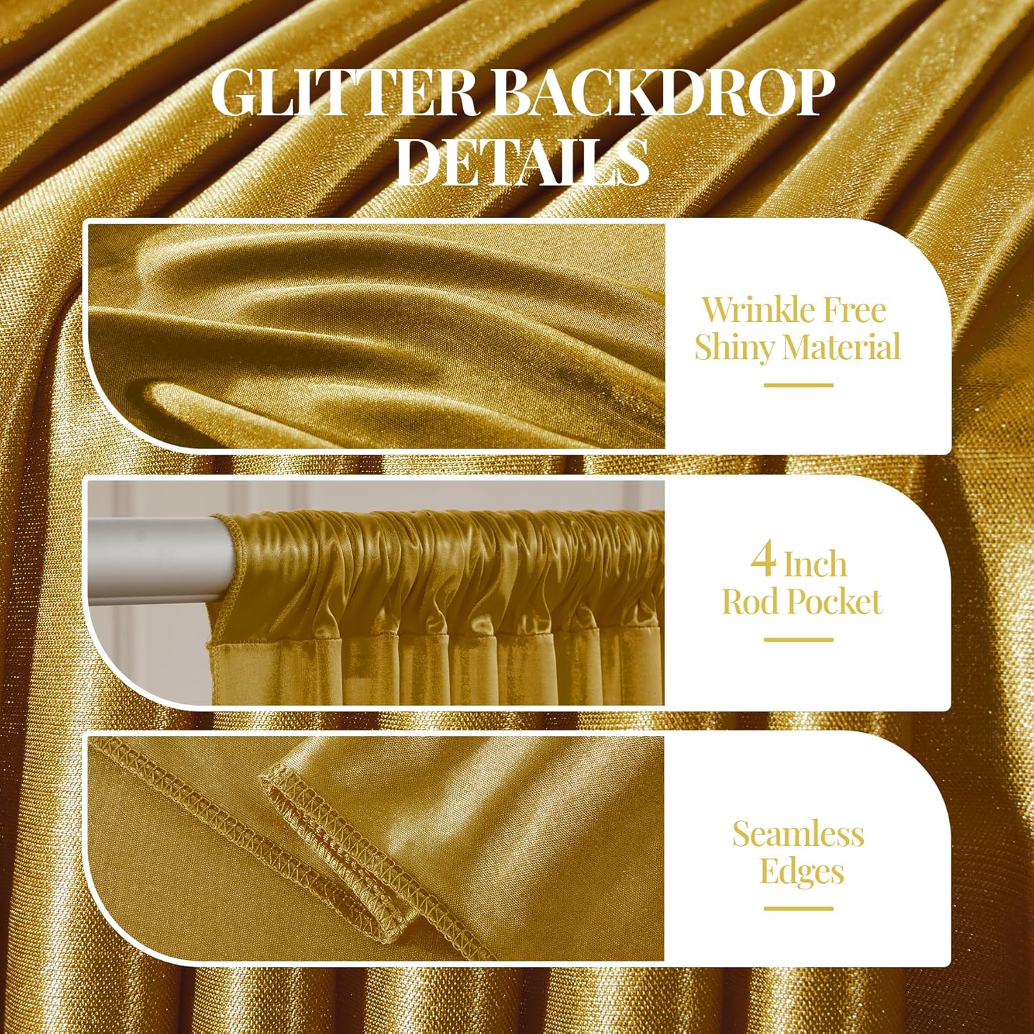 - 【Satin Backdrop Curtain】Our 10x10ft dark gold glitter backdrop curtain panels are perfect for adding a touch of glamour to any event. Made with thick, high-quality satin fabric, they shimmer beautifully without losing sequins, ensuring a stunning display. Each set includes two 5x10ft panels, providing ample coverage for weddings, parties, or photo shoots.