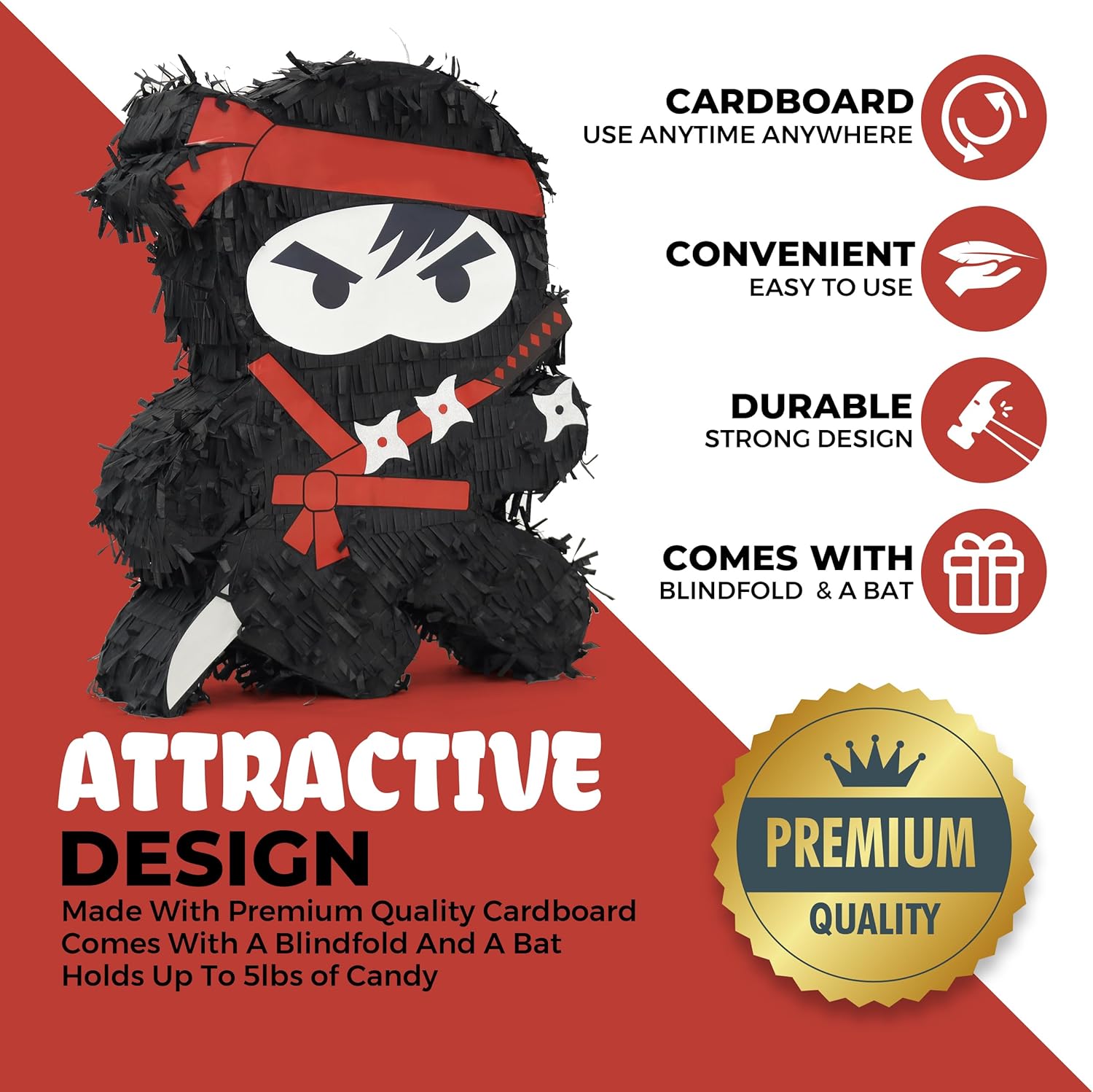 - ❤️【 PERFECT FOR A FUN PARTY】- Use the ninja pinata as decoration for parties or have guests take turns to try and break the pinata to release all the candies inside.