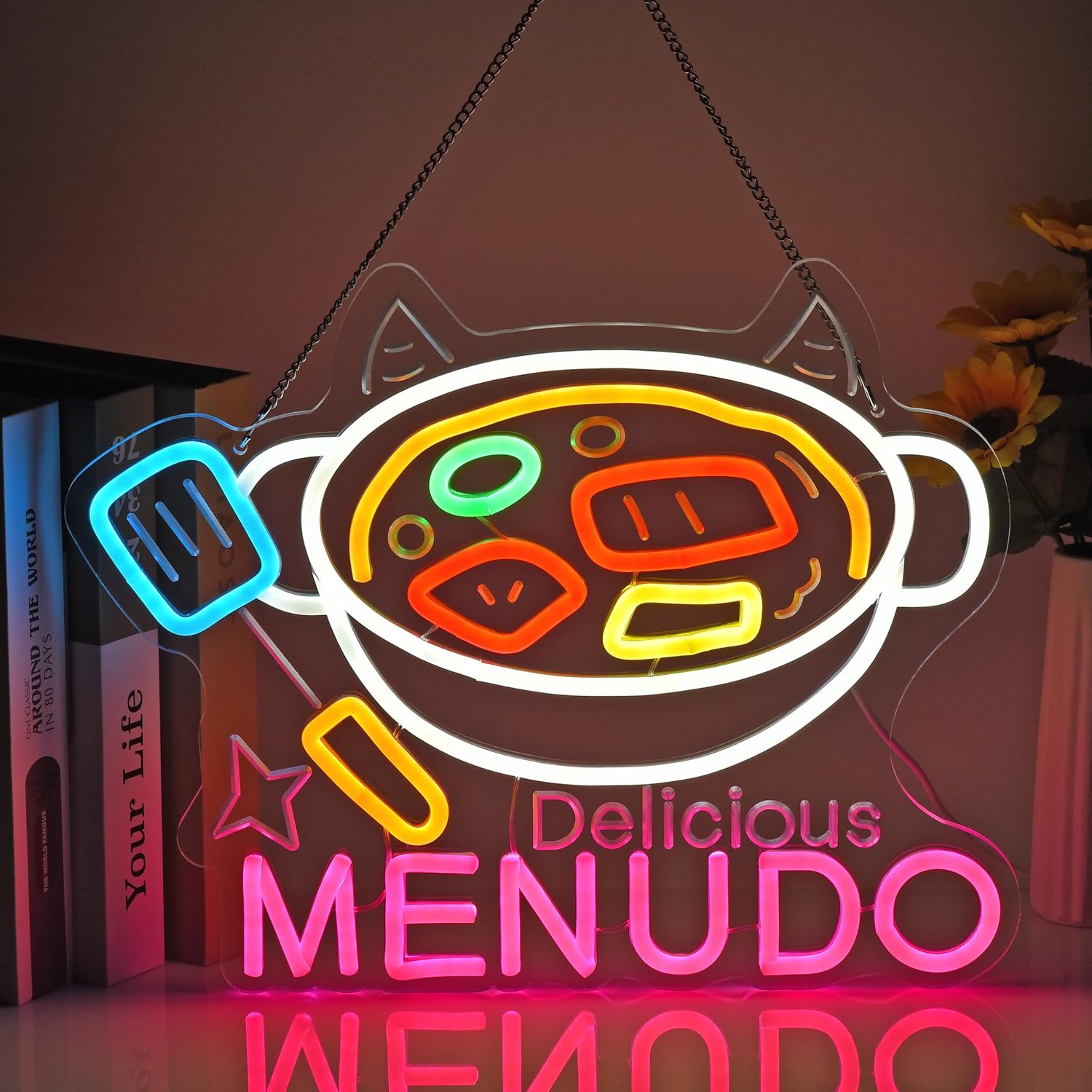 - Make Your Business Stand Out: The neon sign is composed of patterns of a pot with food inside, a spatula and the words “MENUDO”,with adjustable brightness. Its high-recognition design and vibrant color can attract customers' attention over a long distance let them know easily what your business is, and bring them to your restaurant/bar/shop/club/store; It can also create a great atmosphere if placed inside the room.
