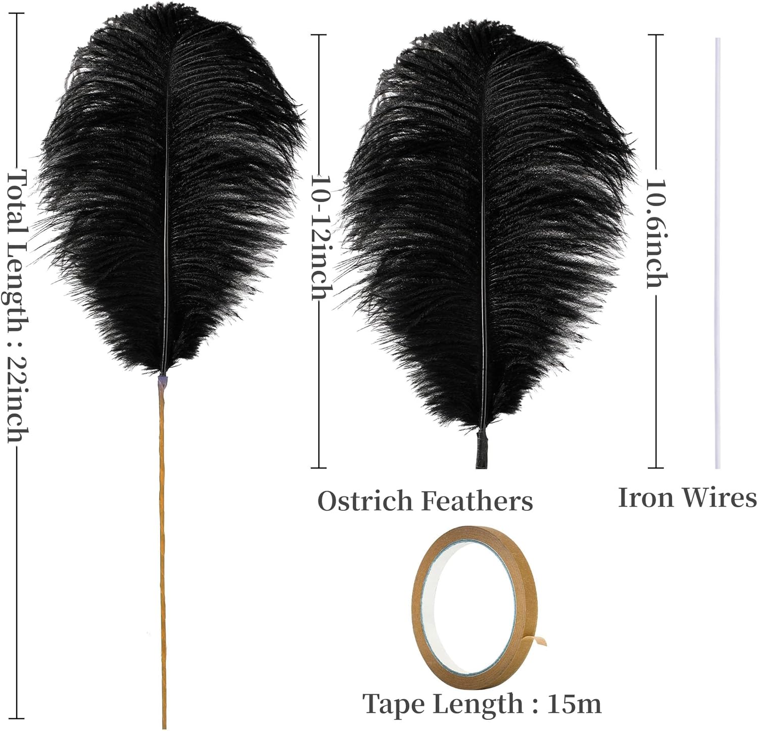 - 22inch Ostrich Feathrs Kit: 20pcs 10-12 inches black white and gray mixed ostrich feathers, 20 pcs 10 inches long iron wire, and a roll of 15m light brown tape. Rich set content to meet your decoration and use needs