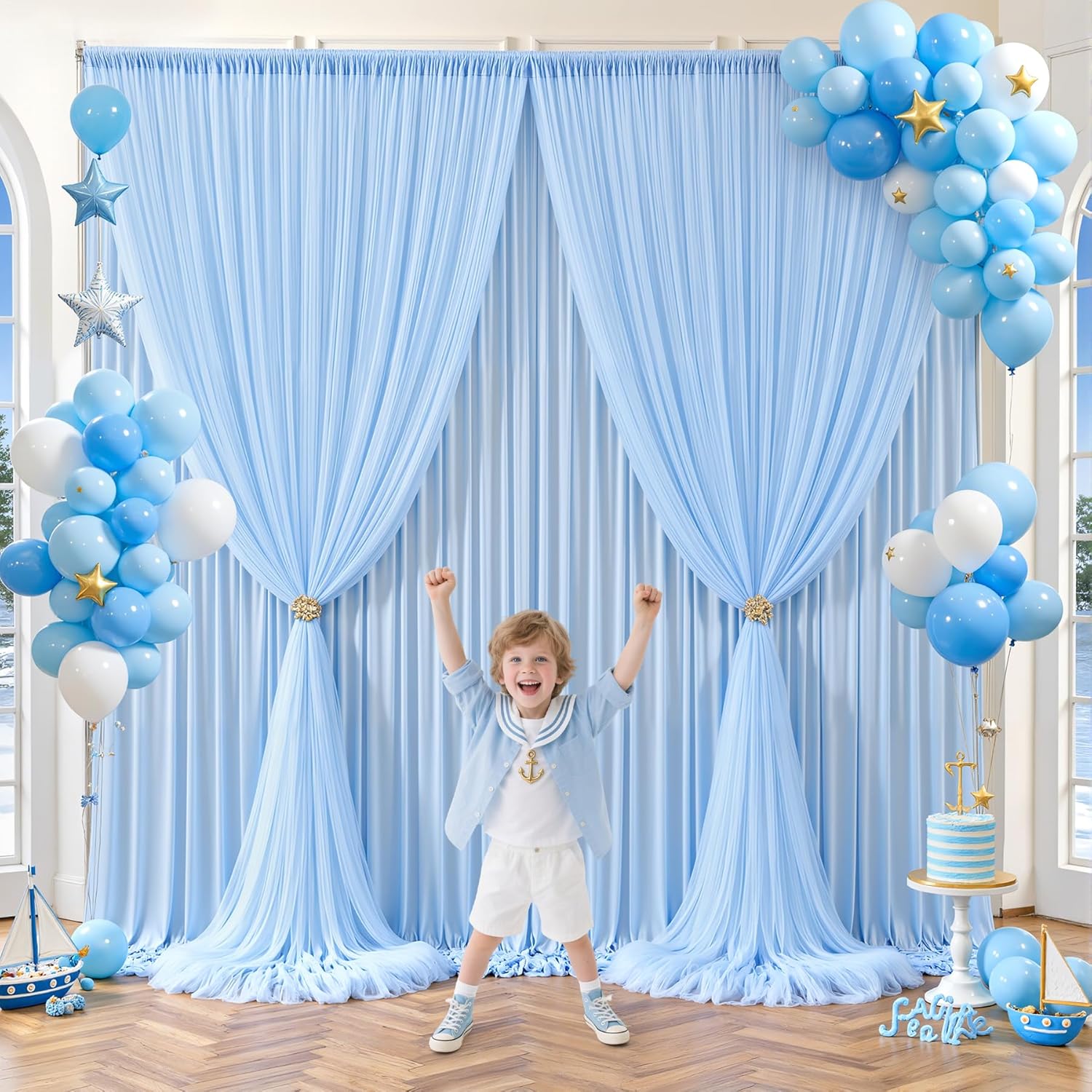 - Baby Blue Tulle Drapes for Backdrop Suitable for:The Baby Blue tulle backdrop curtain is suitable for wedding,bridal shower,baby showers,birthday parties,engagement parties,holiday celebrations,engagement party, baptism, Photography,stage curtain, photo booth, birthday pictures, candy buffets,graduation party and anniversary.The Baby Blue drapes for backdrop match with balloons, banners,photo props,flower and other party decorations will make the scene more beautiful,elegant and magical.